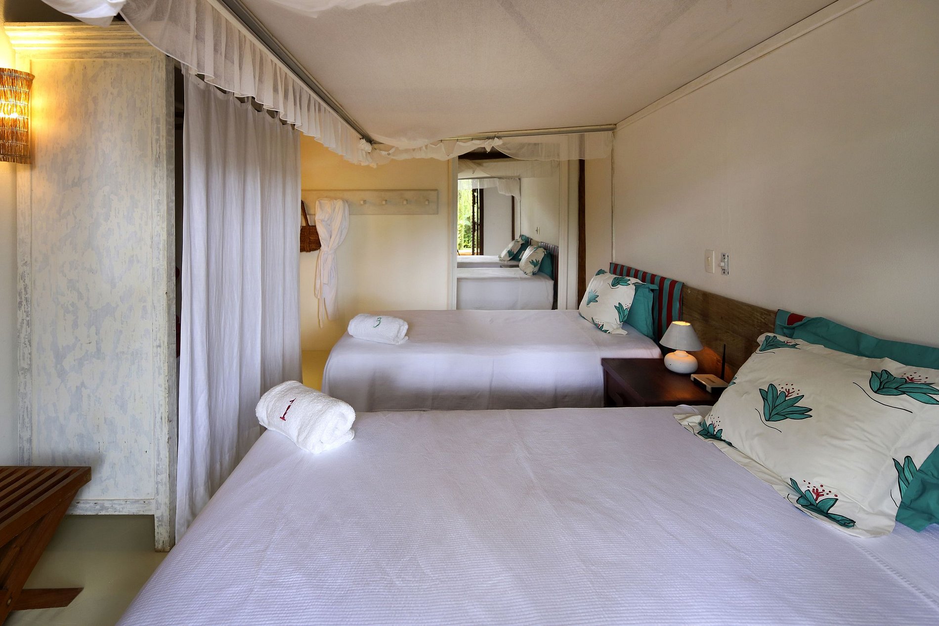 -Chambre 2 – avec propre salle de bains, 2 grands lits d´une personne qui peuvent être transformés en un confortable lit queen size, véranda privée avec vue sur la mer et la rivière.
