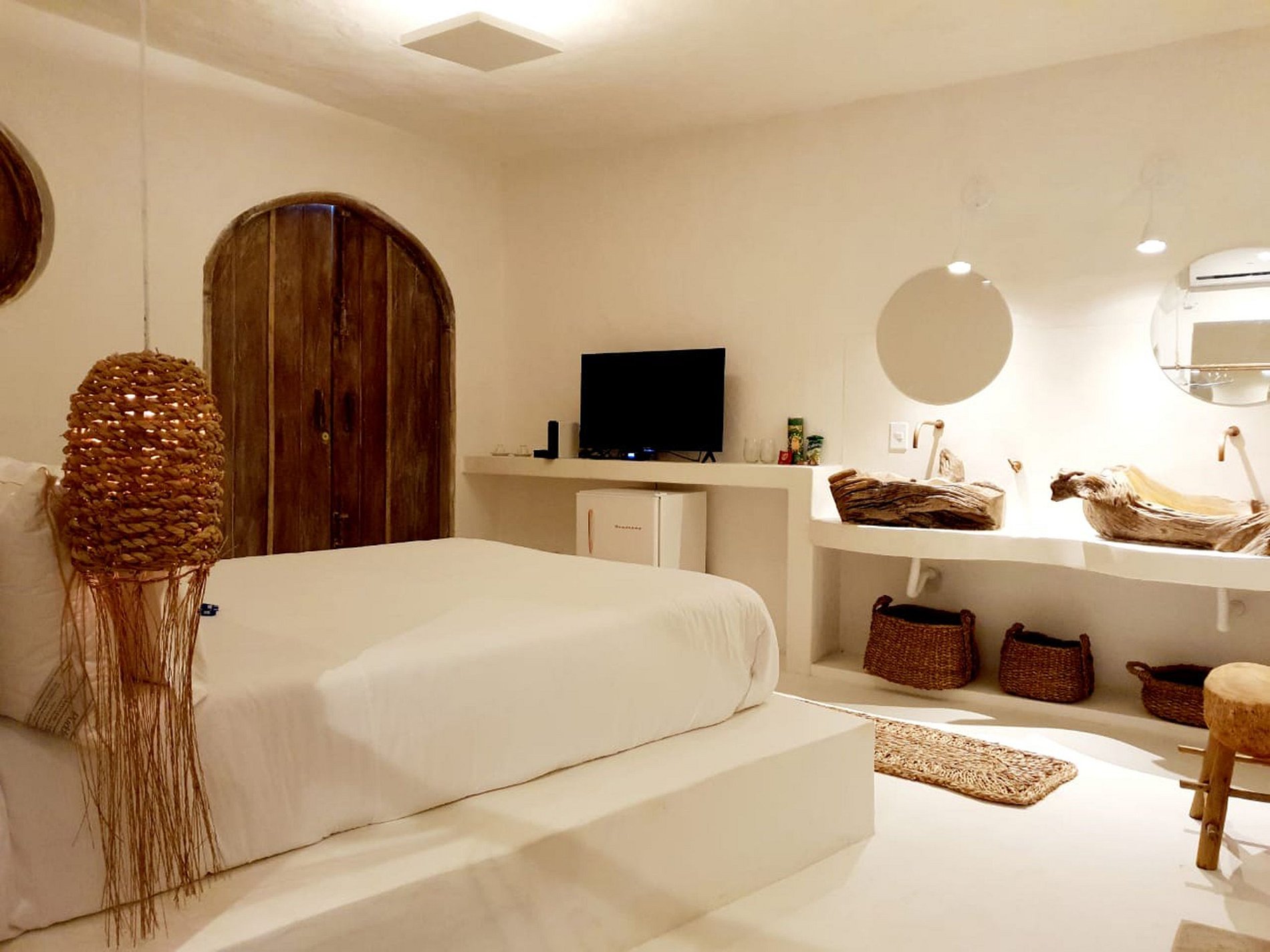 Avec un total de 8 suites luxueuses et située à seulement 180 mètres de la plage, cette villa promet de transformer votre séjour sur la plage paradisiaque de Bahia en une expérience inoubliable. Chaque chambre est une œuvre d'art en soi, variant en configuration et en style, garantissant une intimité et un confort exclusifs. De la Chambre Xohã, avec son bain à remous en bois dans un arbre centenaire ou de la Chambre Sol, avec sa mini piscine privée en pierre volcanique, à la Chambre Urataká, avec sa baignoire en ciment brûlé, tous les espaces ont été conçus pour enchanter.