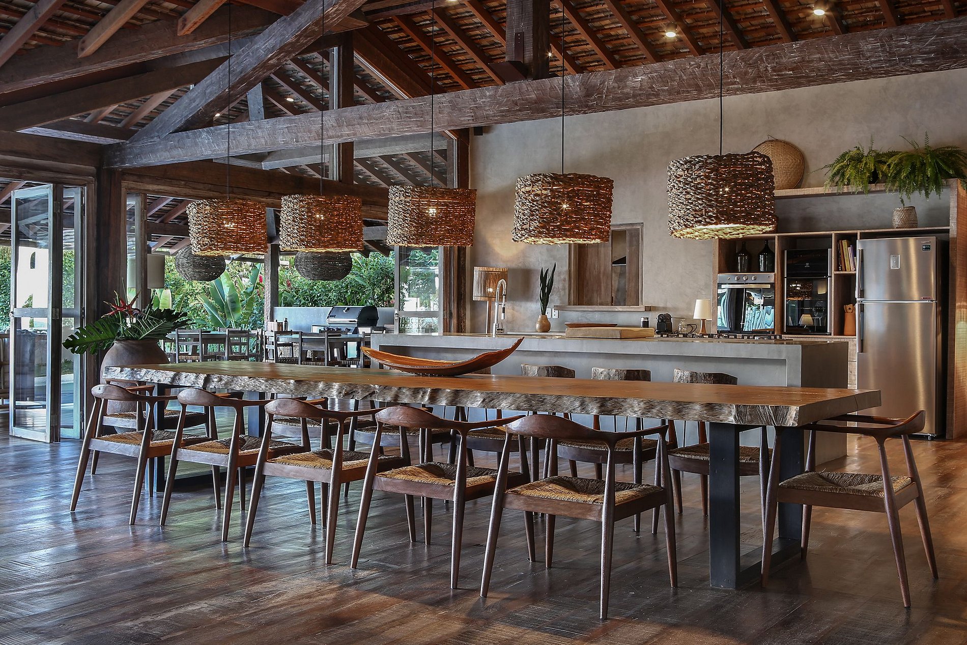 Espaces aux volumes impressionnants, composés d'un grand salon aéré, ouvert de part et d'autre sur la piscine et le jardin tropical, d'une cuisine moderne entièrement équipée avec sa spectaculaire table en bois massif pour 12 personnes devant un long ilot fait em ciment “brulé”.
