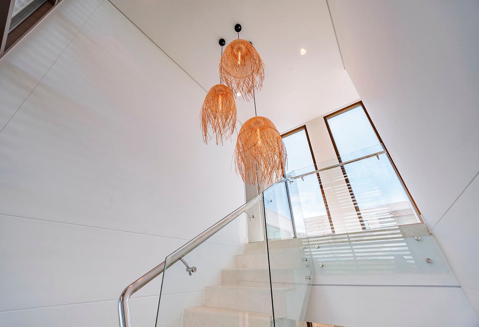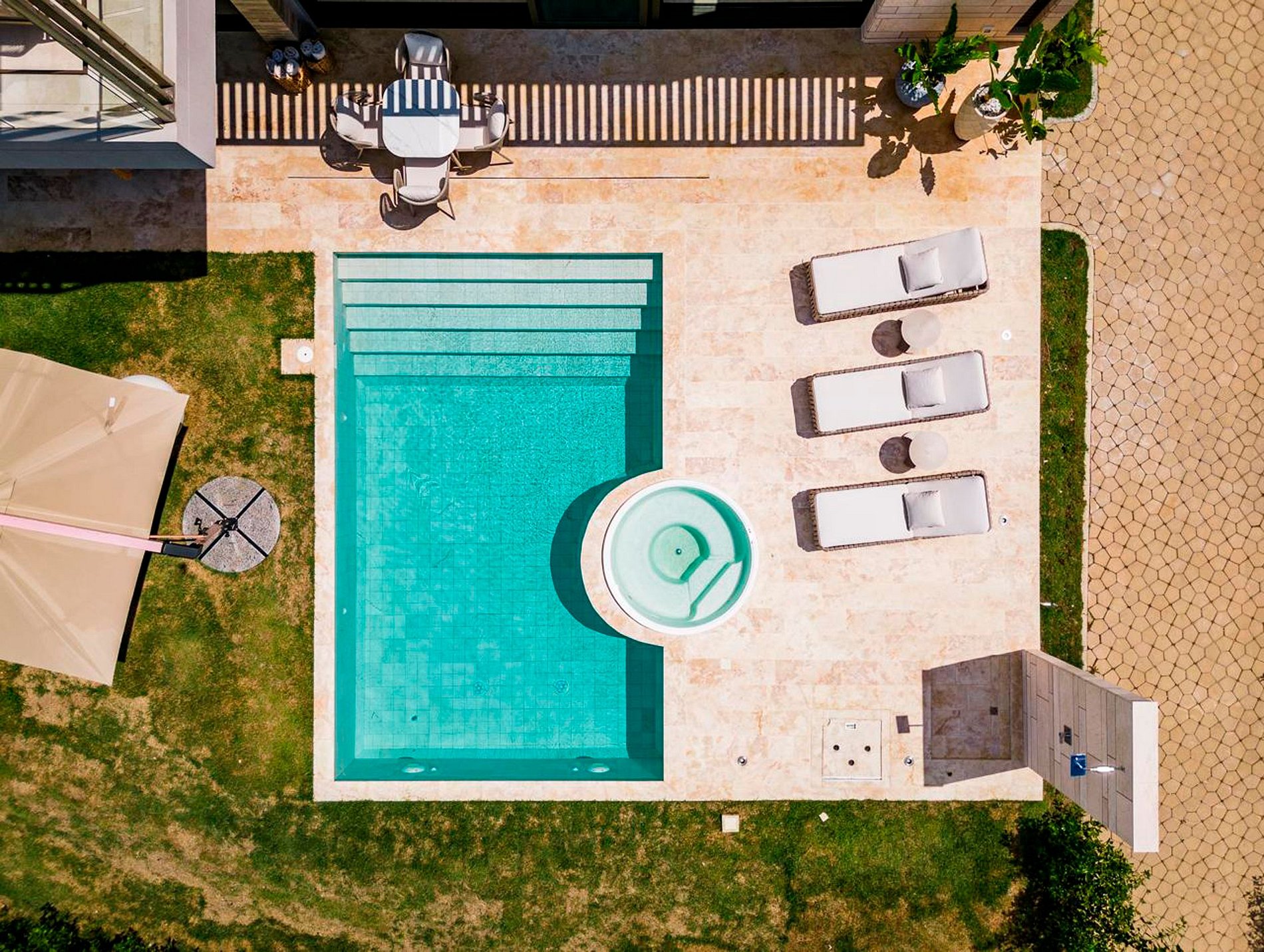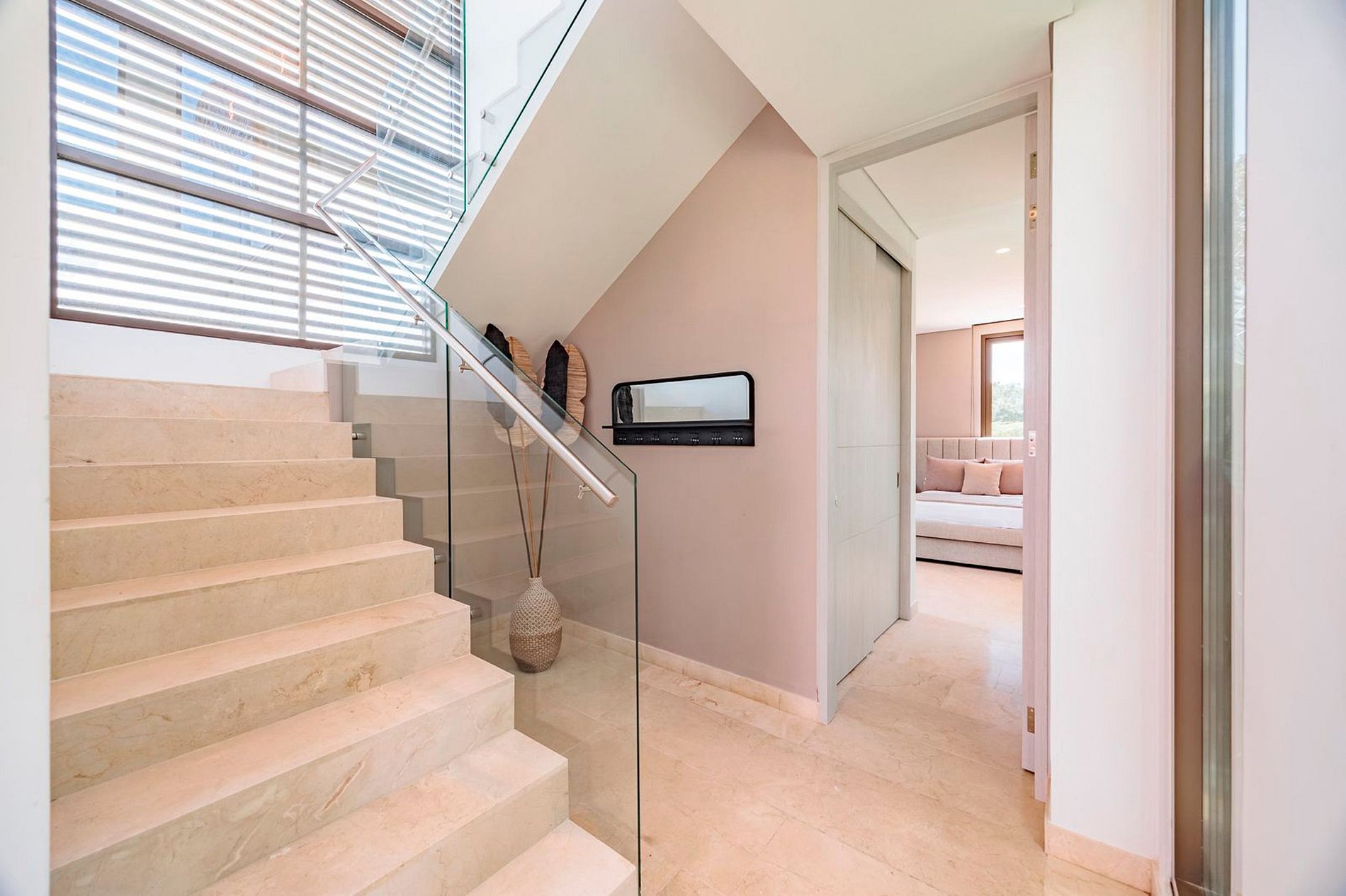 L'intérieur spacieux comprend un élégant salon avec télévision, une salle à manger avec des meubles modernes dans des tons de blanc et de sable qui complètent l'ambiance balnéaire, une cuisine entièrement équipée, une grande salle à manger et une salle de divertissement. À l'extérieur, il y a une piscine et un jacuzzi entourés d'une zone de bronzage, et une terrasse au deuxième étage offrant une vue imprenable sur la mer. De plus, il y a une chambre pour le personnel de service.
