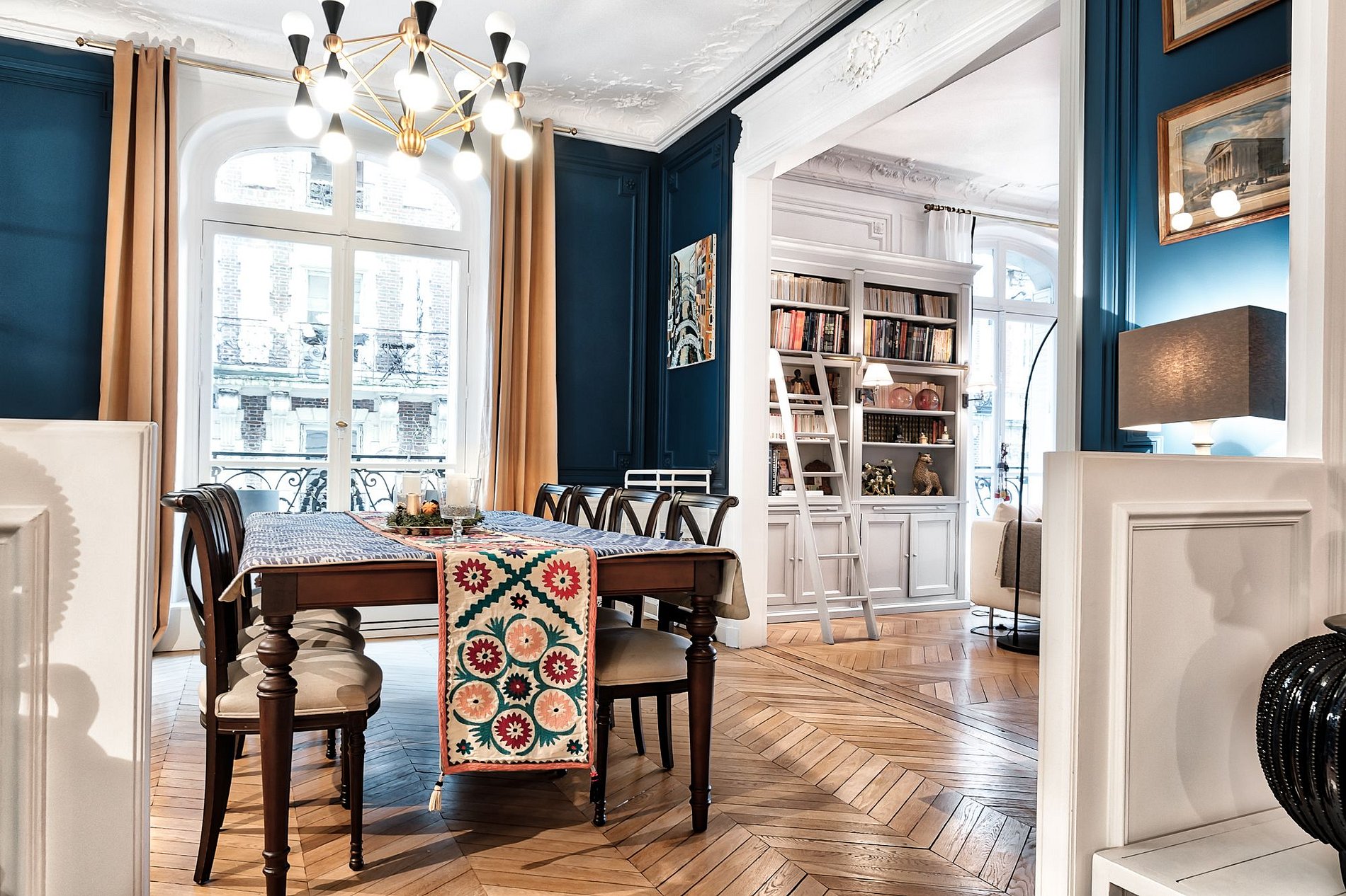 Dès l'entrée dans l'appartement, on est accueilli par un espace de vie spacieux qui combine sans effort relaxation et sophistication. Le coin salon/bibliothèque offre un parfait refuge pour des séances de lecture calmes ou des conversations engageantes, entouré d'étagères élégantes et de sièges confortables. Adjacent à cela, la salle à manger est prête à accueillir des repas mémorables, que ce soit pour des rassemblements intimes ou des dîners plus formels. L'espace est soigneusement conçu pour encourager la convivialité et les aventures culinaires.