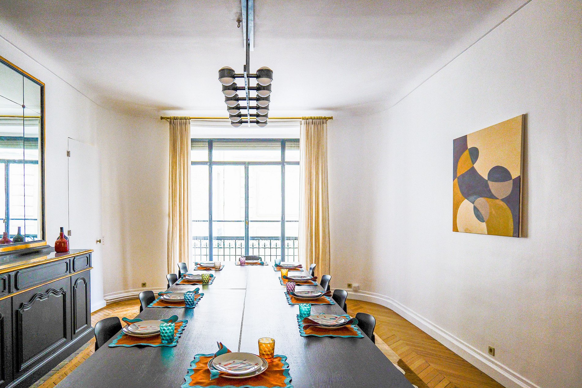 Adjacent aux espaces de salon, la salle à manger se présente comme un témoignage de l'engagement de l'appartement envers l'accueil et les rassemblements sociaux. Cet espace est élégamment aménagé pour accueillir des dîners ou des repas intimes, offrant un mélange de confort et d'opulence rare à trouver.