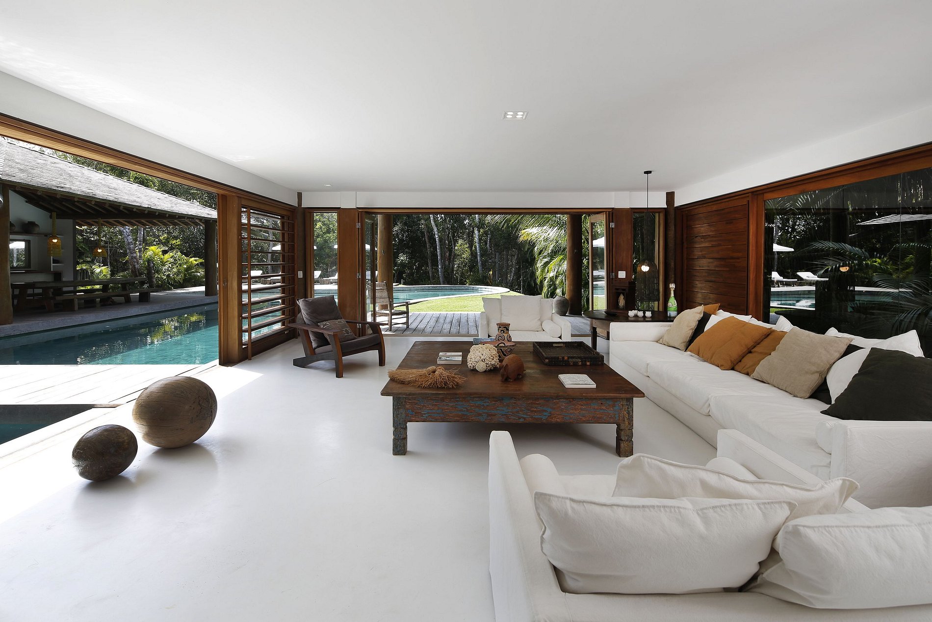 Tous ces espaces de vie sont ouverts sur la piscine et sur le jardin tropical.Dans le jardin, de discrets et charmants bungalows, de bonne proportion, possèdent 03 chambre supplémentaires, chacune avec leurs salle de bain.La propriété est construite autour d'une piscine aux courbes subtiles, remplie d'une eau translucide qui reflète le soleil brilliant du sud de l'état de Bahia.