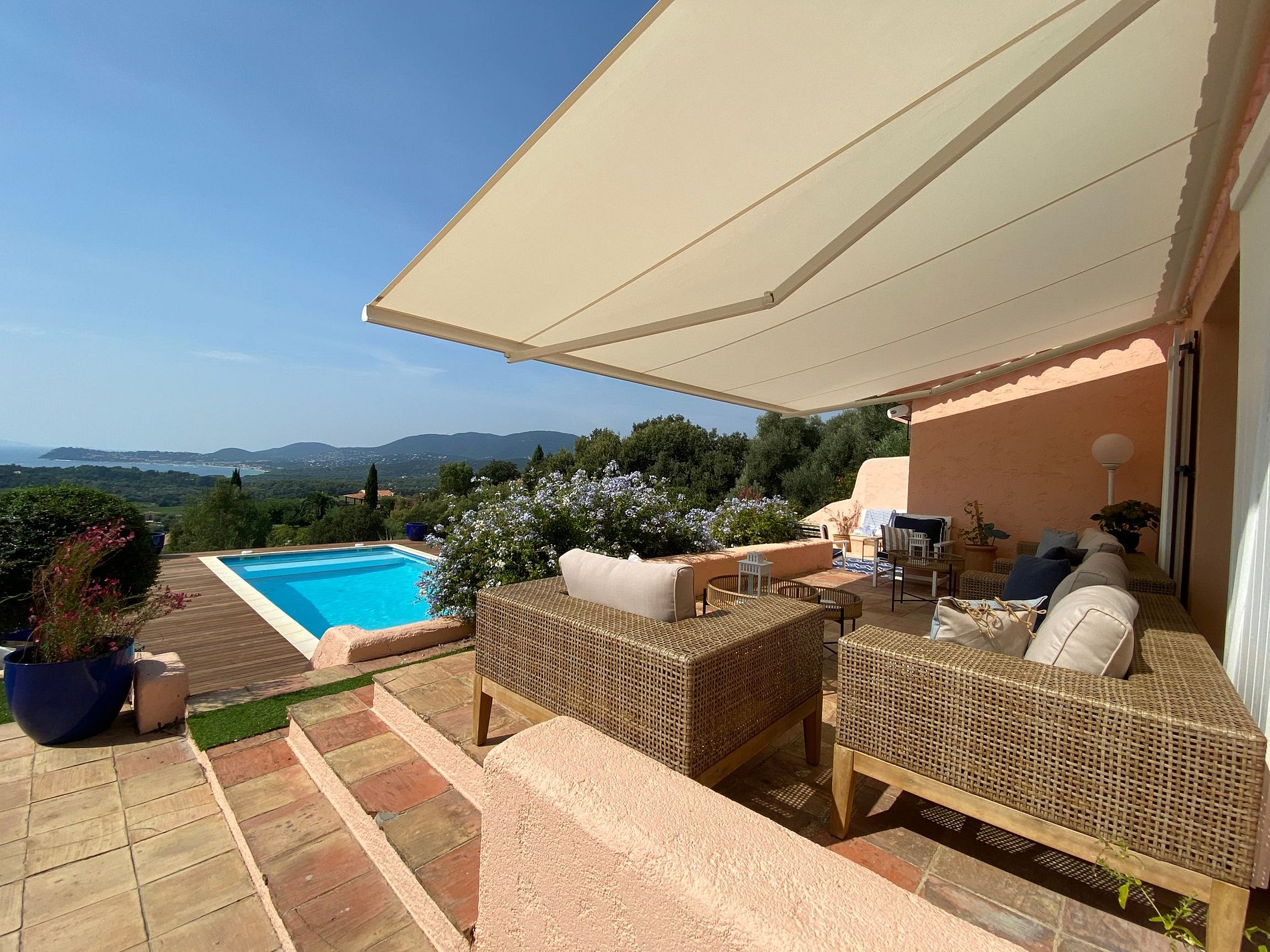Villa nichée à flanc de colline avec une vue imprenable sur l'océan sur les Iles d'Or, cette magnifique villa de style néo-provençal possède une architecture authentique ainsi que les couleurs ocre de la douceur méditerranéenne.