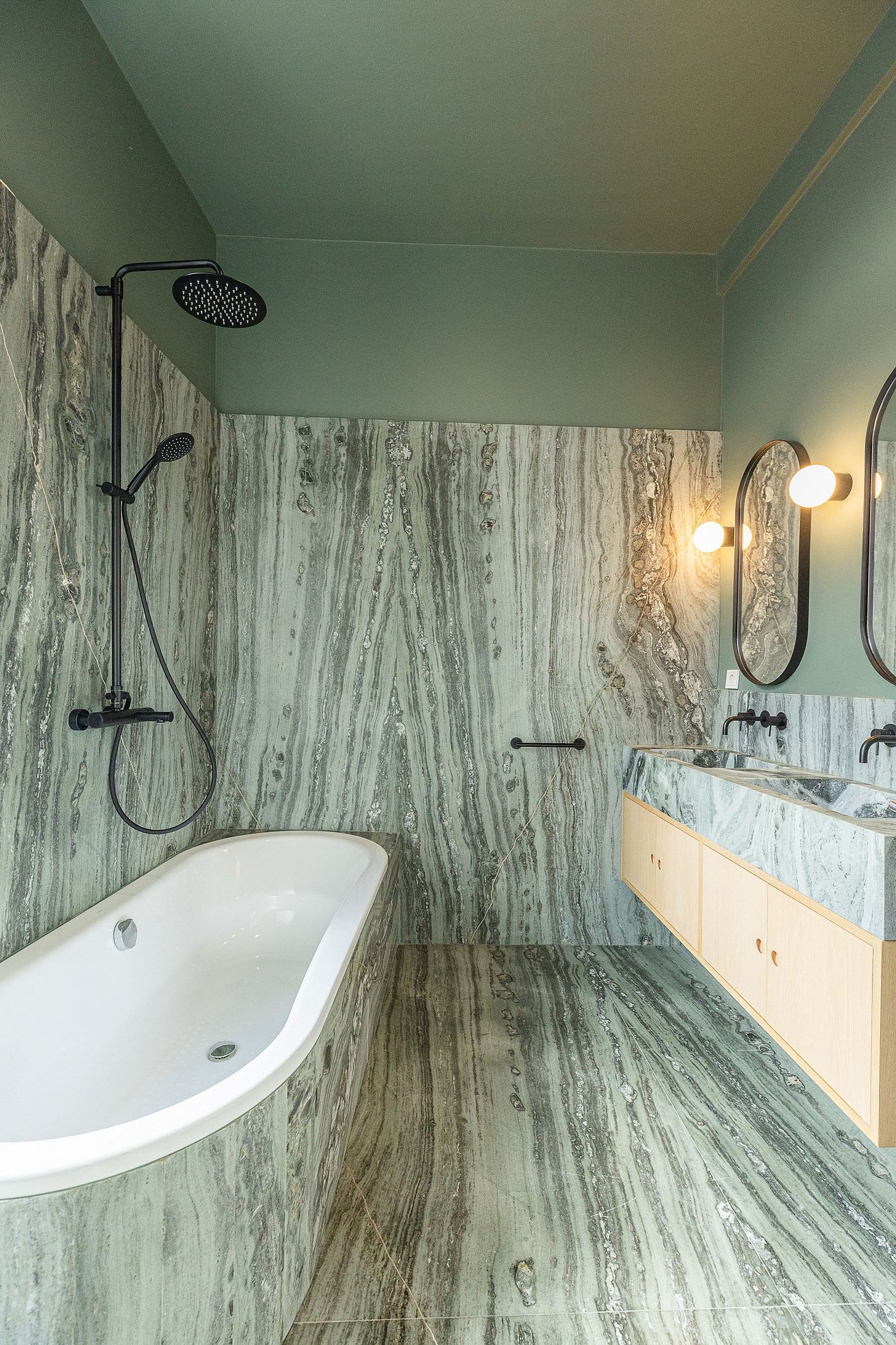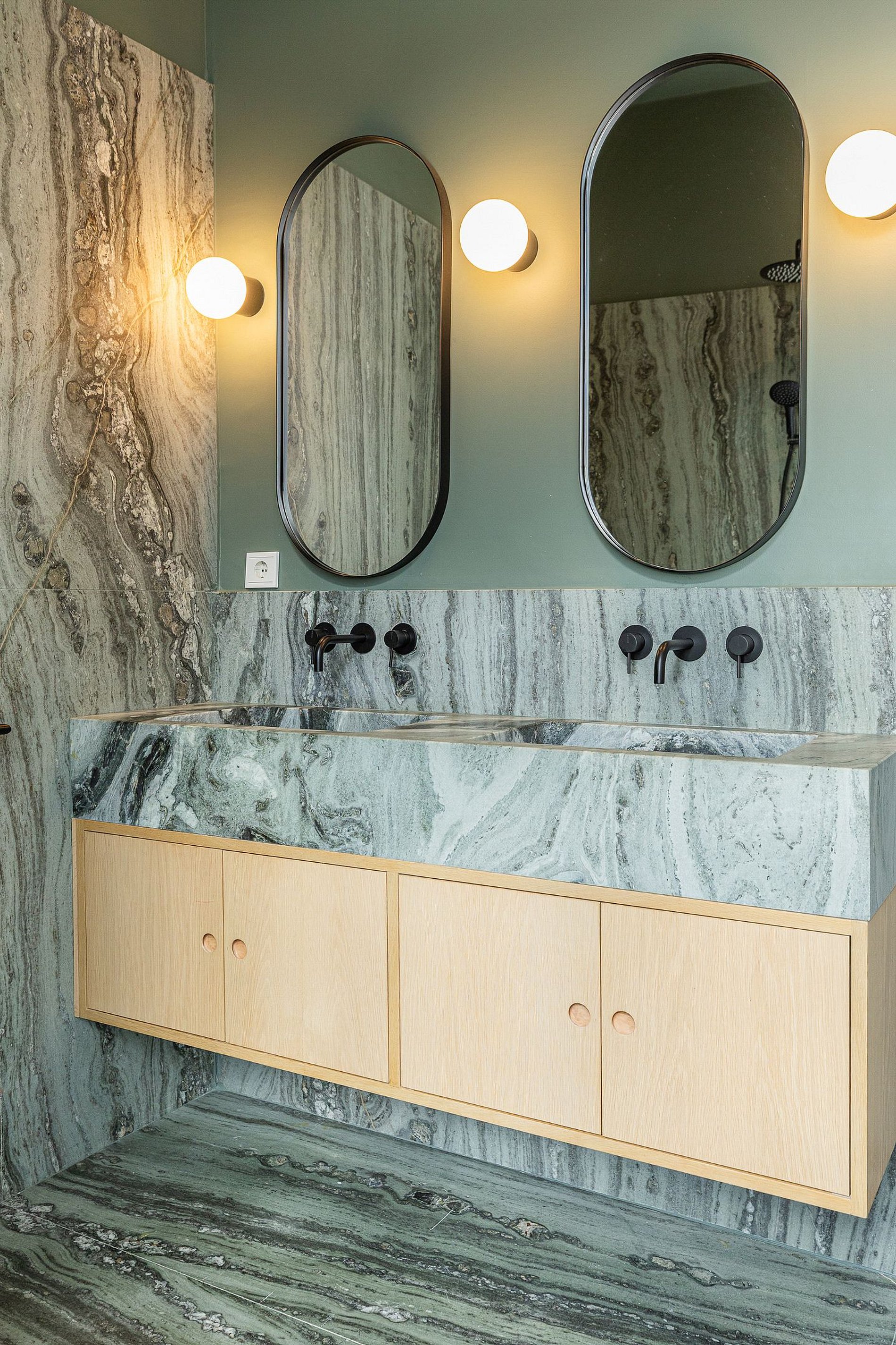 La cuisine et les salles de bains disposent de finitions en marbre, associées à des menuiseries en bois, dans un ensemble sobre et cohérent.