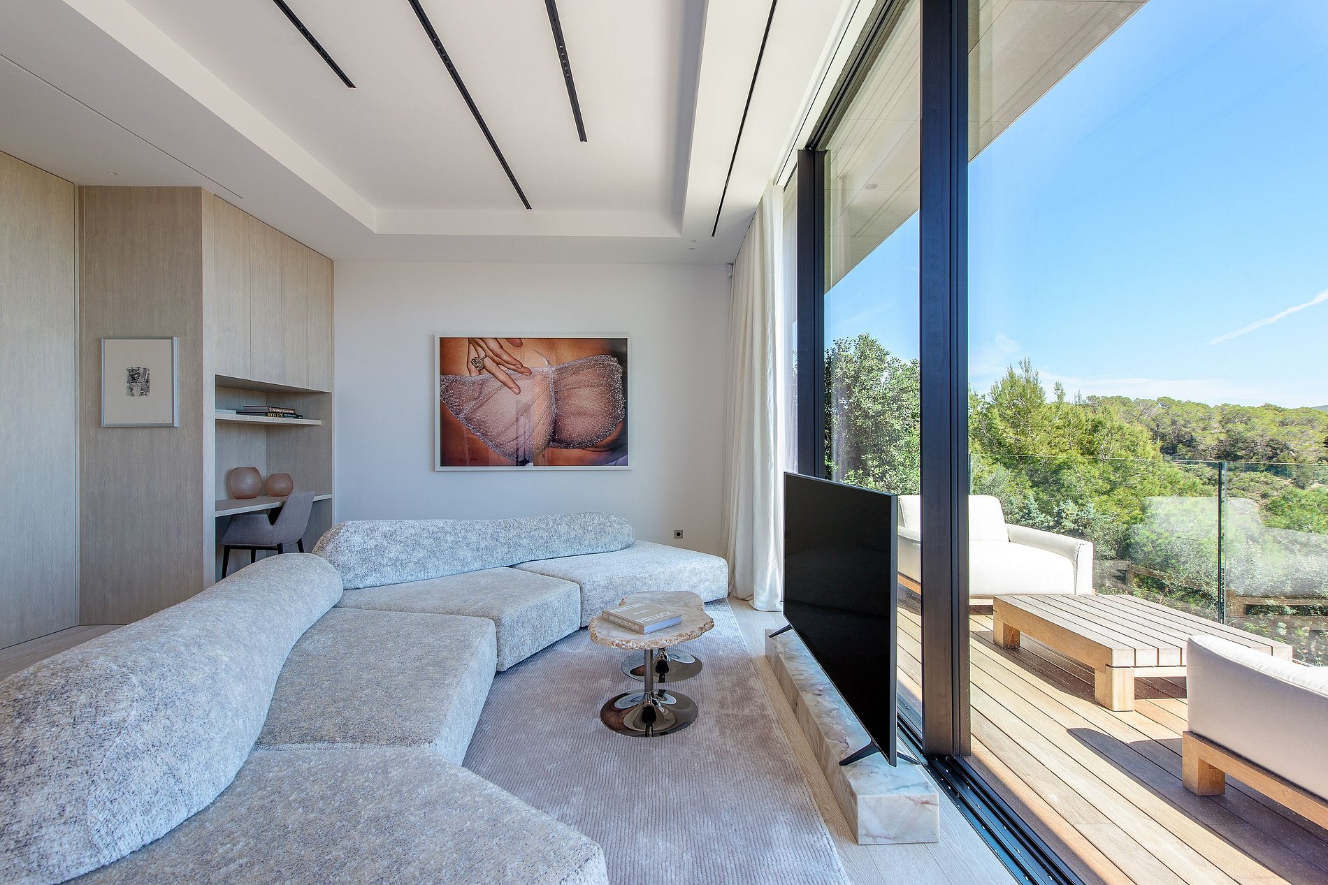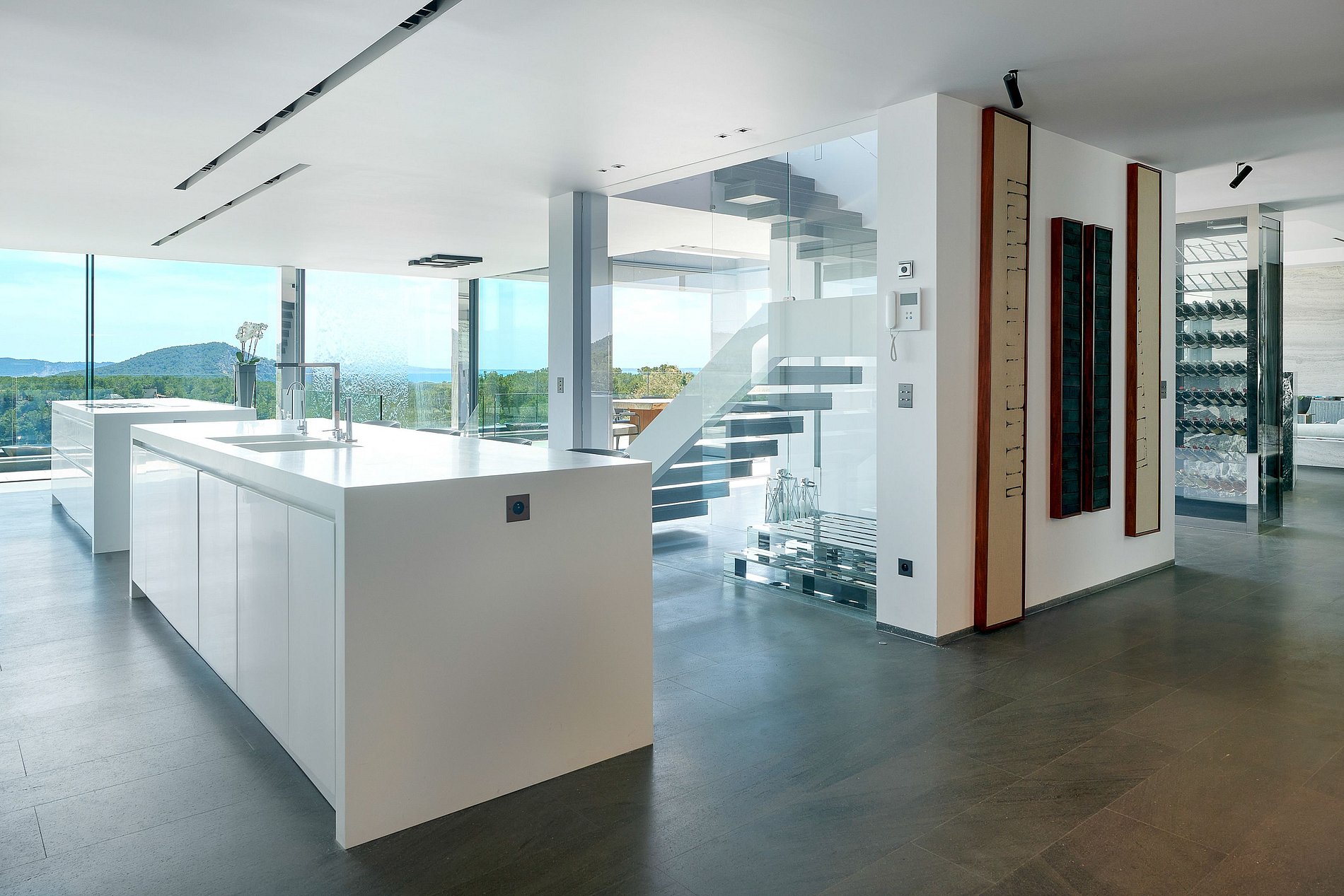 Dès l’entrée, vous êtes accueilli par un hall majestueux avec vue panoramique, qui mène à un vaste salon ouvert avec un grand canapé, une TV 360°, une cheminée élégante et un accès direct à une terrasse spectaculaire avec salon extérieur, offrant une vue imprenable sur le jardin, la mer et la nature. L’espace bar comprend un bar entièrement équipé et une cave à vins raffinée, sélectionnant les plus grands crus du monde. La cuisine professionnelle ouverte est idéale pour recevoir, avec : • Plaque à gaz, four, micro-ondes, lave-vaisselle • Congélateur, presse-agrumes, bouilloire, machine à espresso Rocket avec grains de café Veil • Bar central et coin petit-déjeuner Un espace parfait pour un petit-déjeuner convivial, un déjeuner décontracté ou un dîner raffiné.