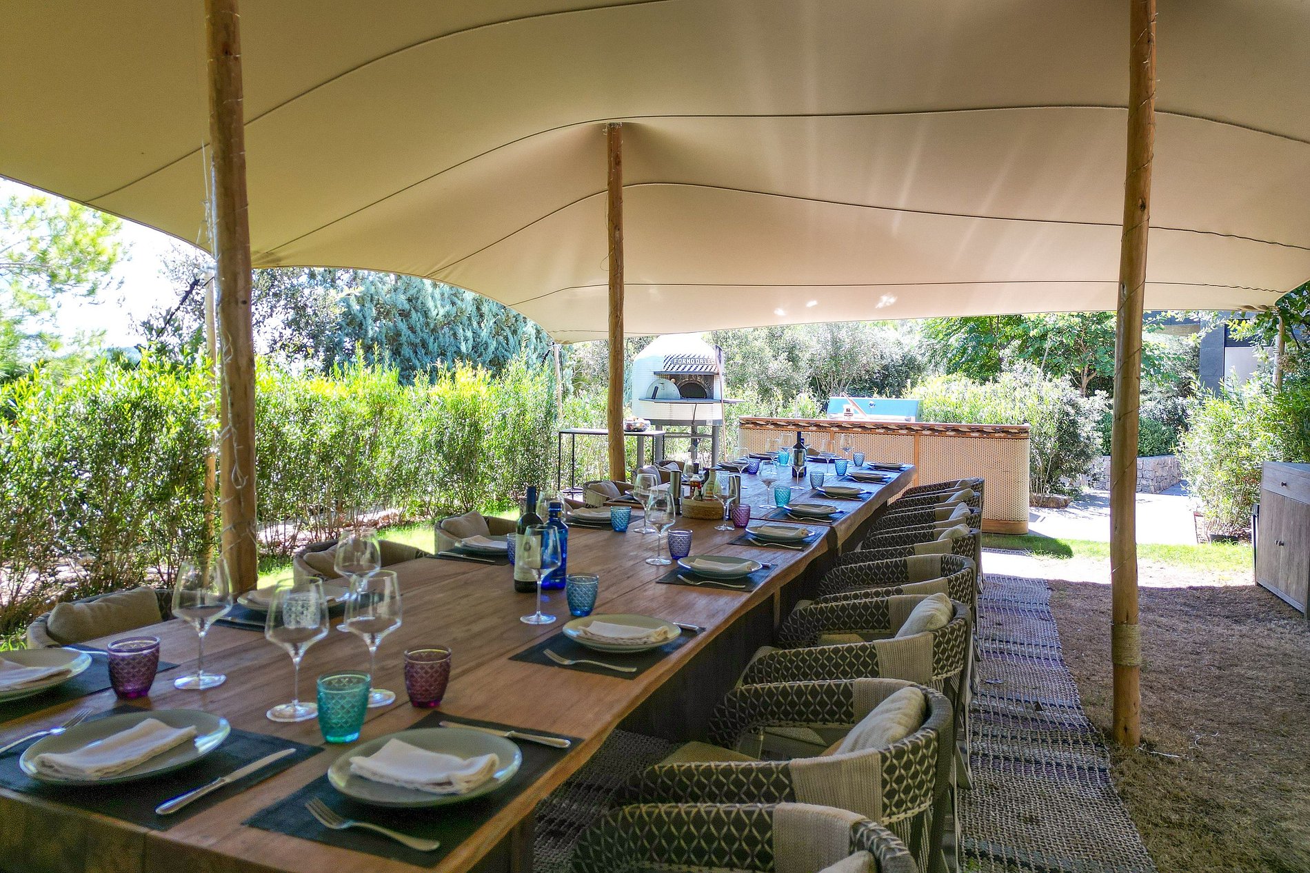REZ-DE-CHAUSSÉE – Extérieur La terrasse principale comprend un salon extérieur, un espace repas couvert, et un coin BBQ entièrement équipé avec four à pizza napolitain au feu de bois. Le tout surplombant les jardins luxuriants, la piscine scintillante et la maison d’invités.