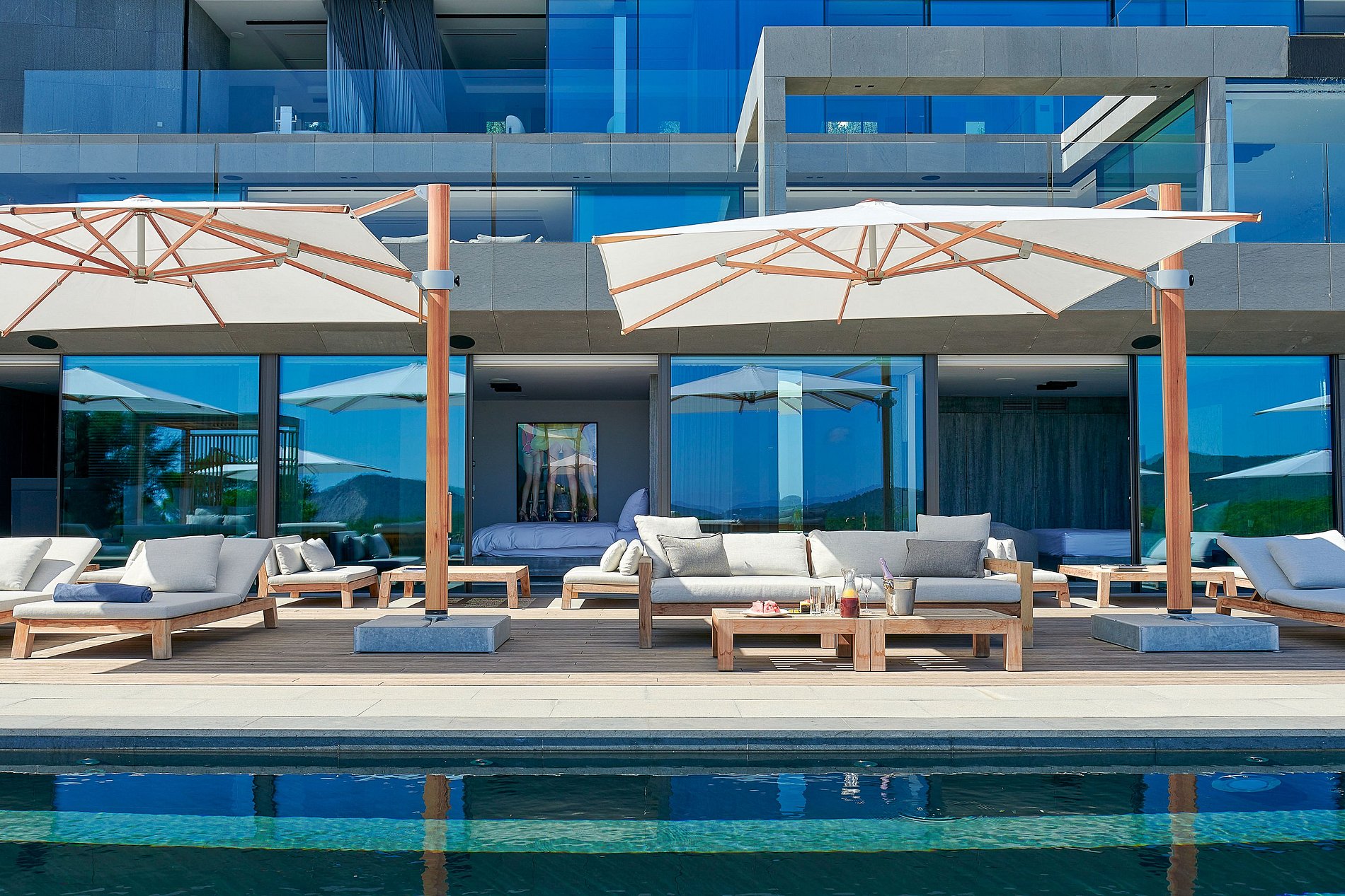 • Suite Invité 1 Lit king-size, salle de bain en suite (baignoire, douche, double vasque), climatisation, stores occultants, coffre-fort. Accès direct à la piscine avec vue mer & nature. (Rez-de-chaussée) • Suite Invité 2 Lit king-size, salle de bain partagée avec Suite 3 (baignoire, douche, double vasque), climatisation, stores occultants, coffre-fort. Accès à la piscine avec vue. (Rez-de-chaussée) • Suite Invité 3 Deux lits simples, salle de bain partagée avec Suite 2, climatisation, stores occultants, coffre-fort. Accès à la piscine avec vue. (Rez-de-chaussée) • Suite Invité 4 Lit king-size, salle de bain en suite (baignoire, douche, double vasque), climatisation, stores occultants, coffre-fort, TV. Accès direct à la piscine. (Rez-de-chaussée surélevé)
