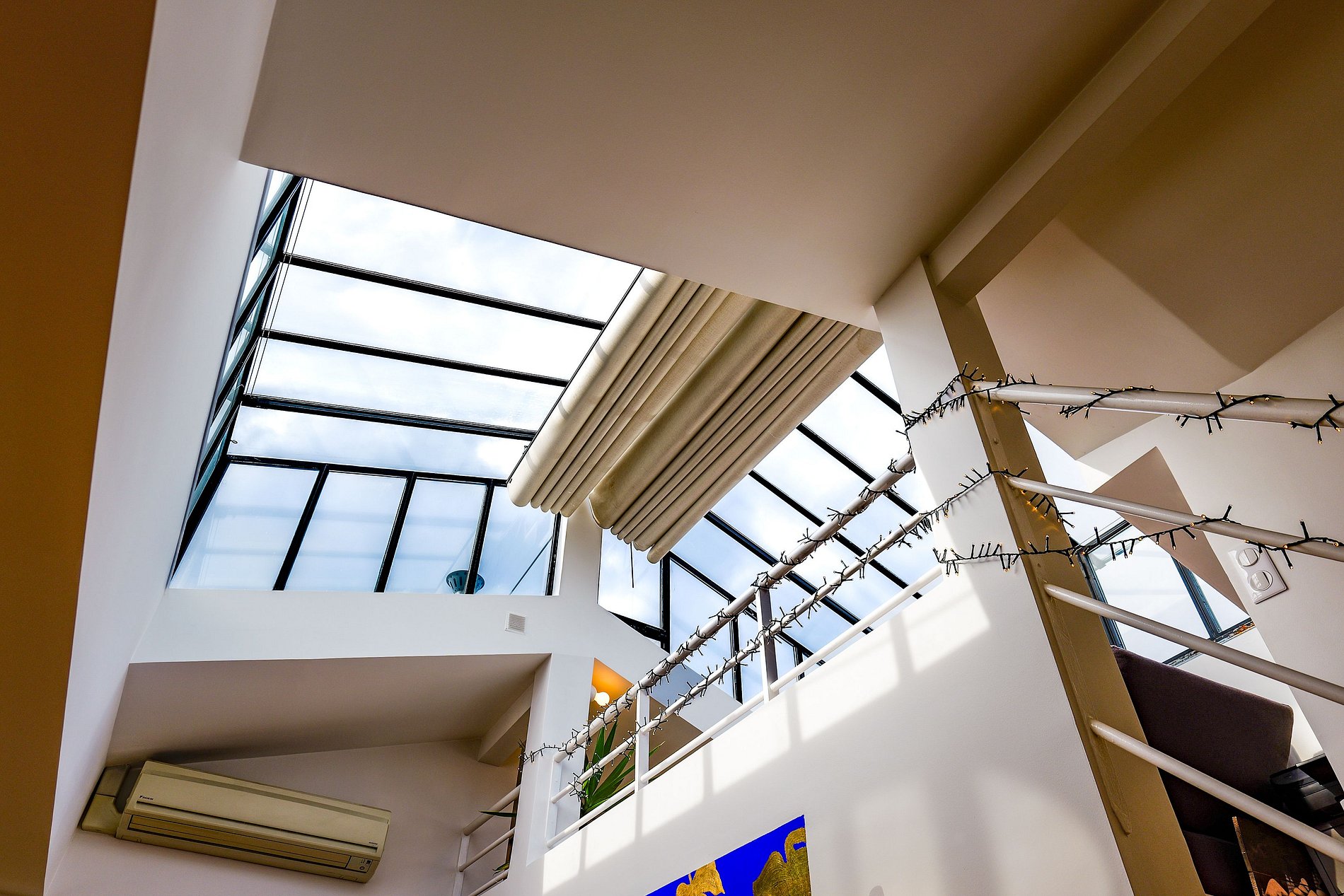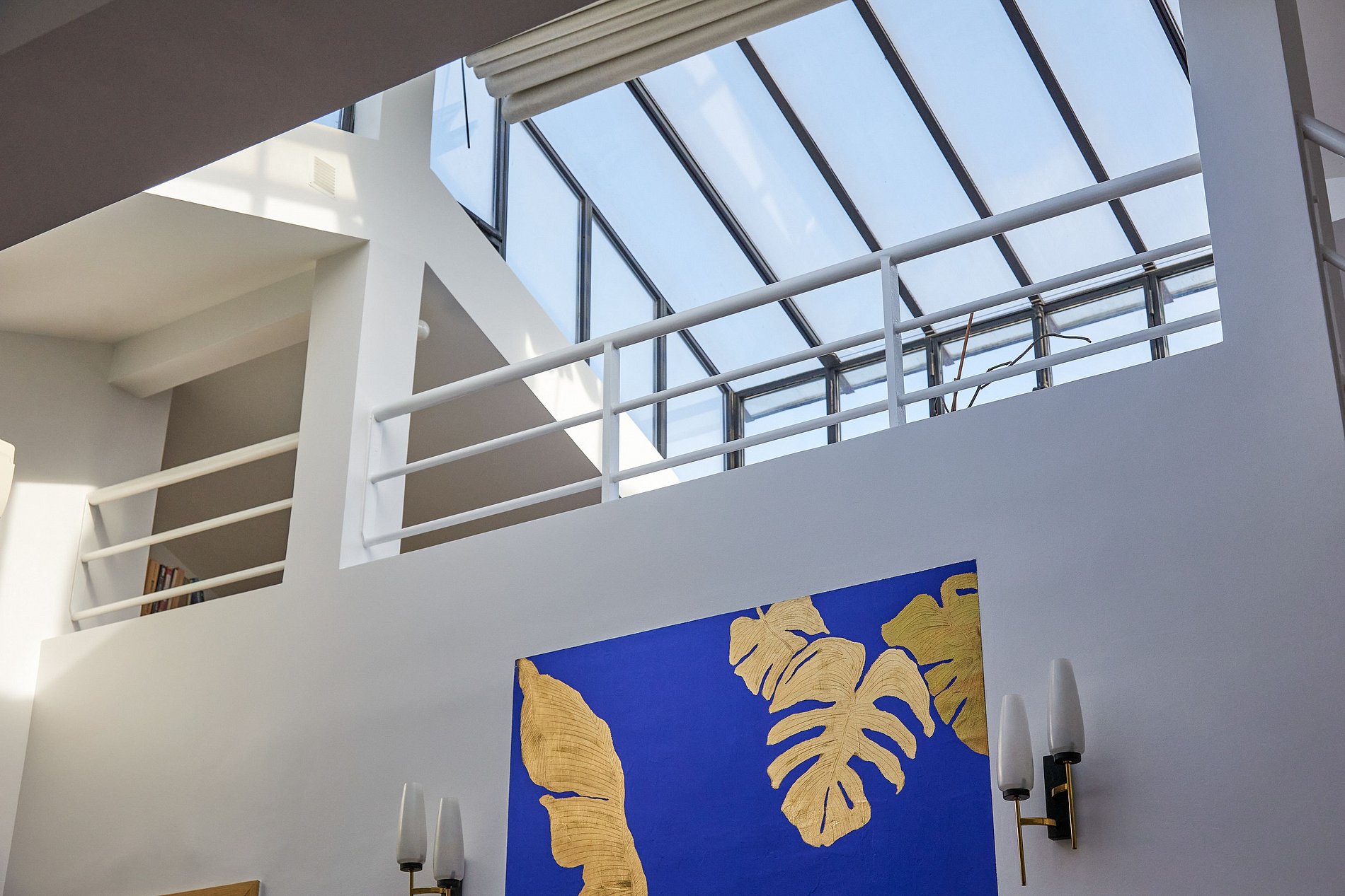 Un escalier élégant mène au 9ème étage, où une vigie vitrée sur les côtés et au-dessus offre une vue panoramique à couper le souffle sur tout Paris. Ce perchoir unique permet d'admirer la ville sous un nouvel angle, faisant de cet appartement un véritable joyau au cœur de la capitale française.