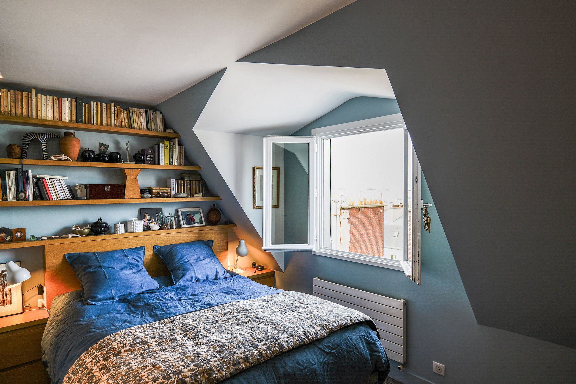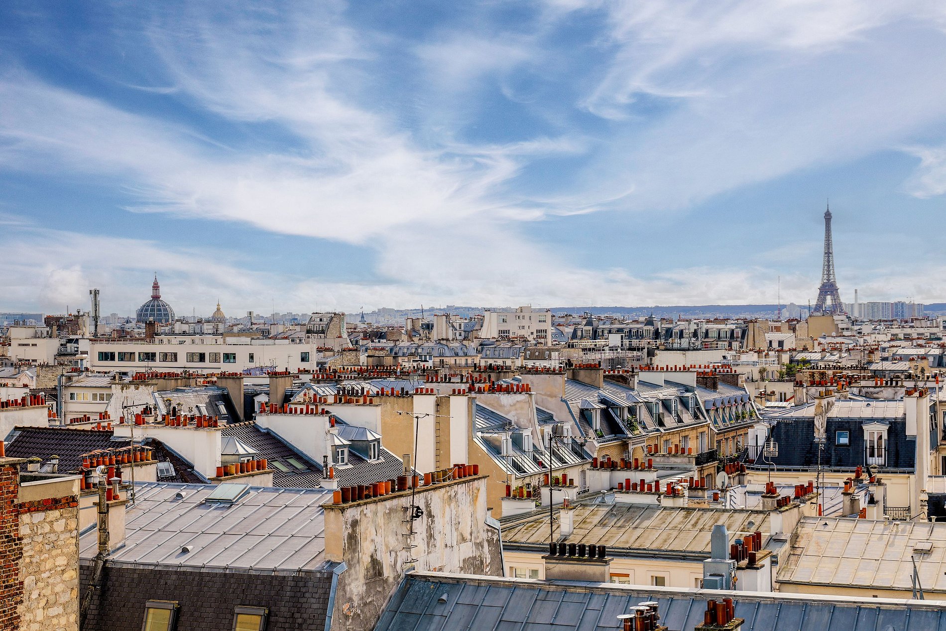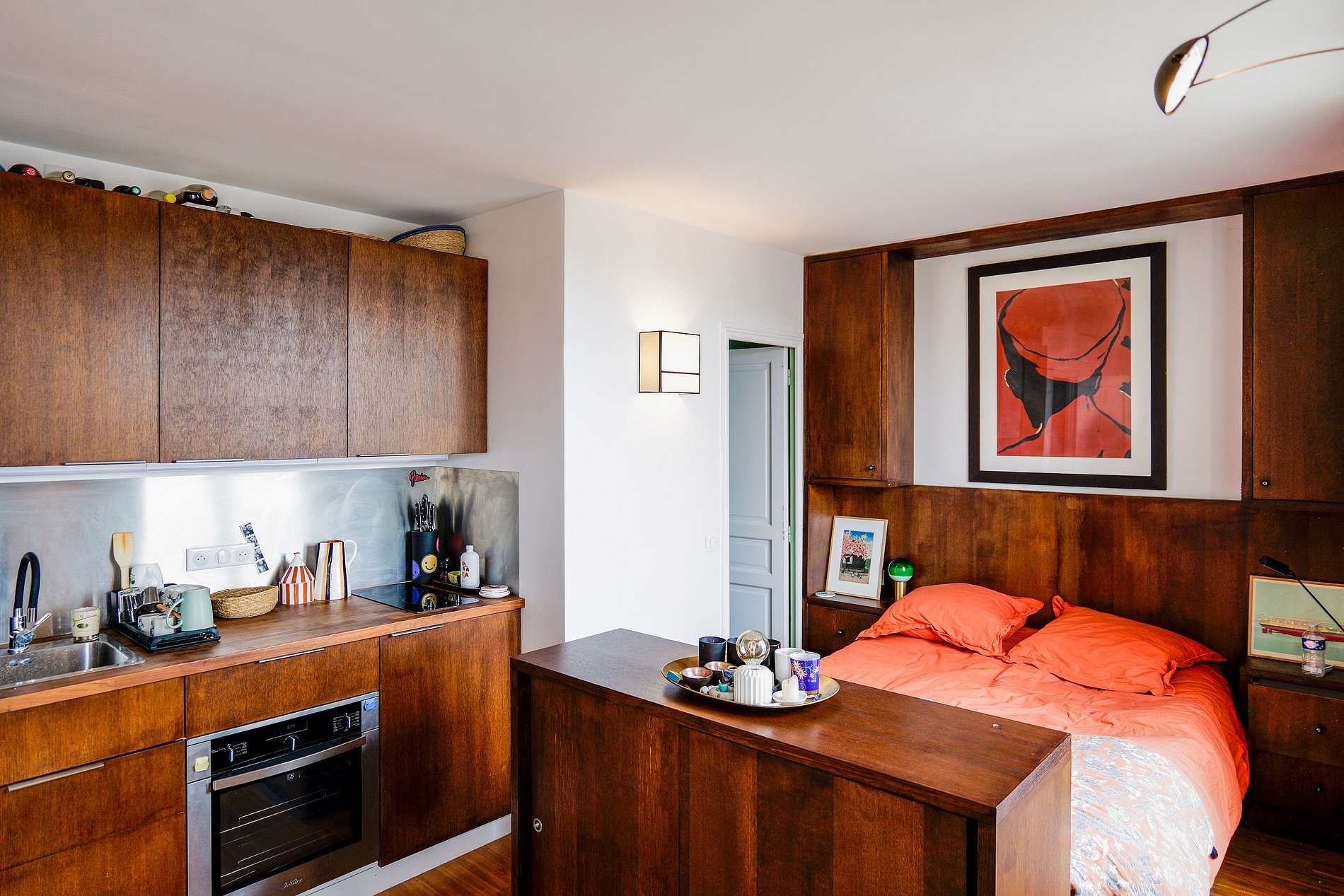 Au 7ème étage, un studio indépendant avec son balcon-terrasse invite à profiter d'un petit déjeuner en surplombant les toits de Paris, offrant ainsi une expérience unique.