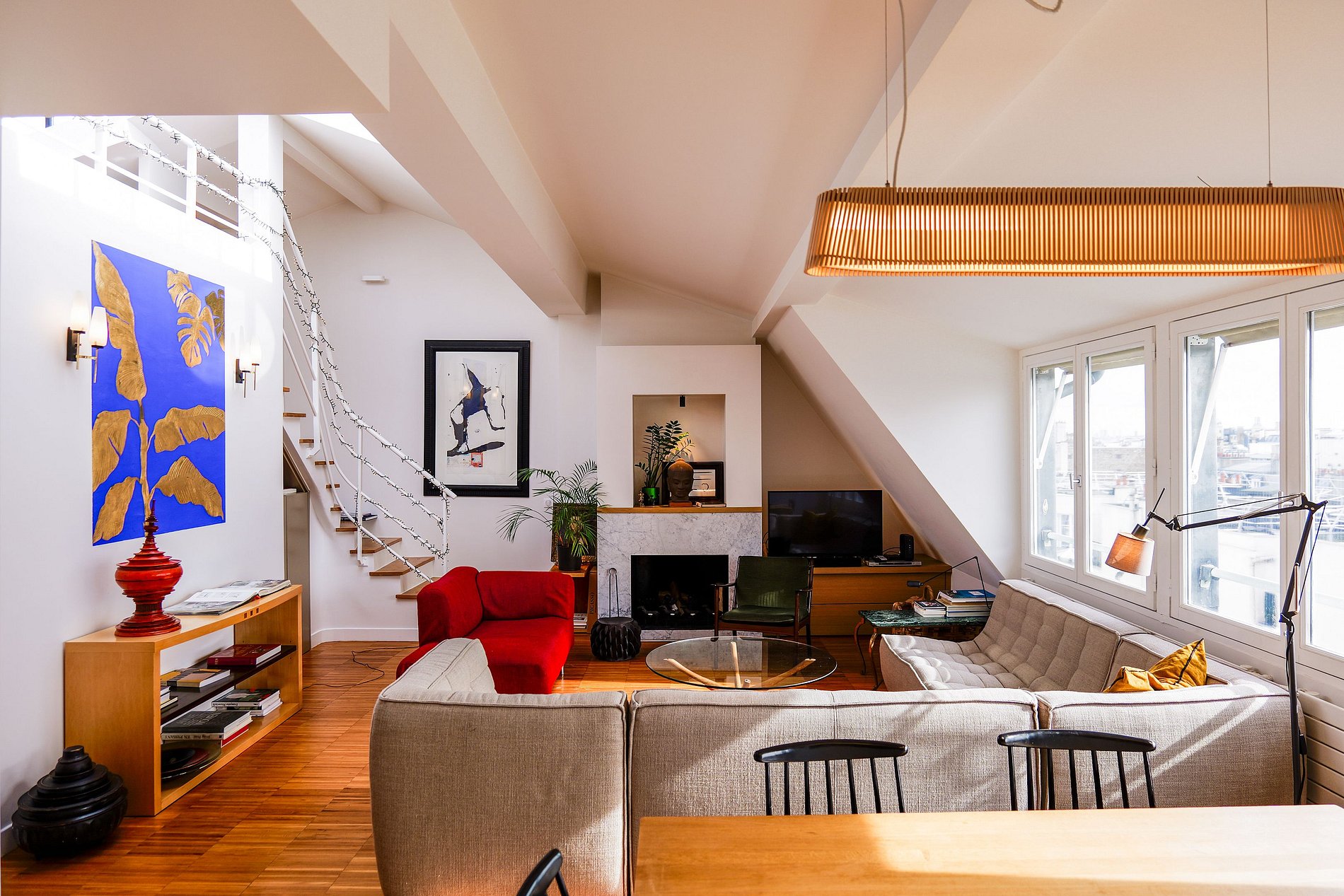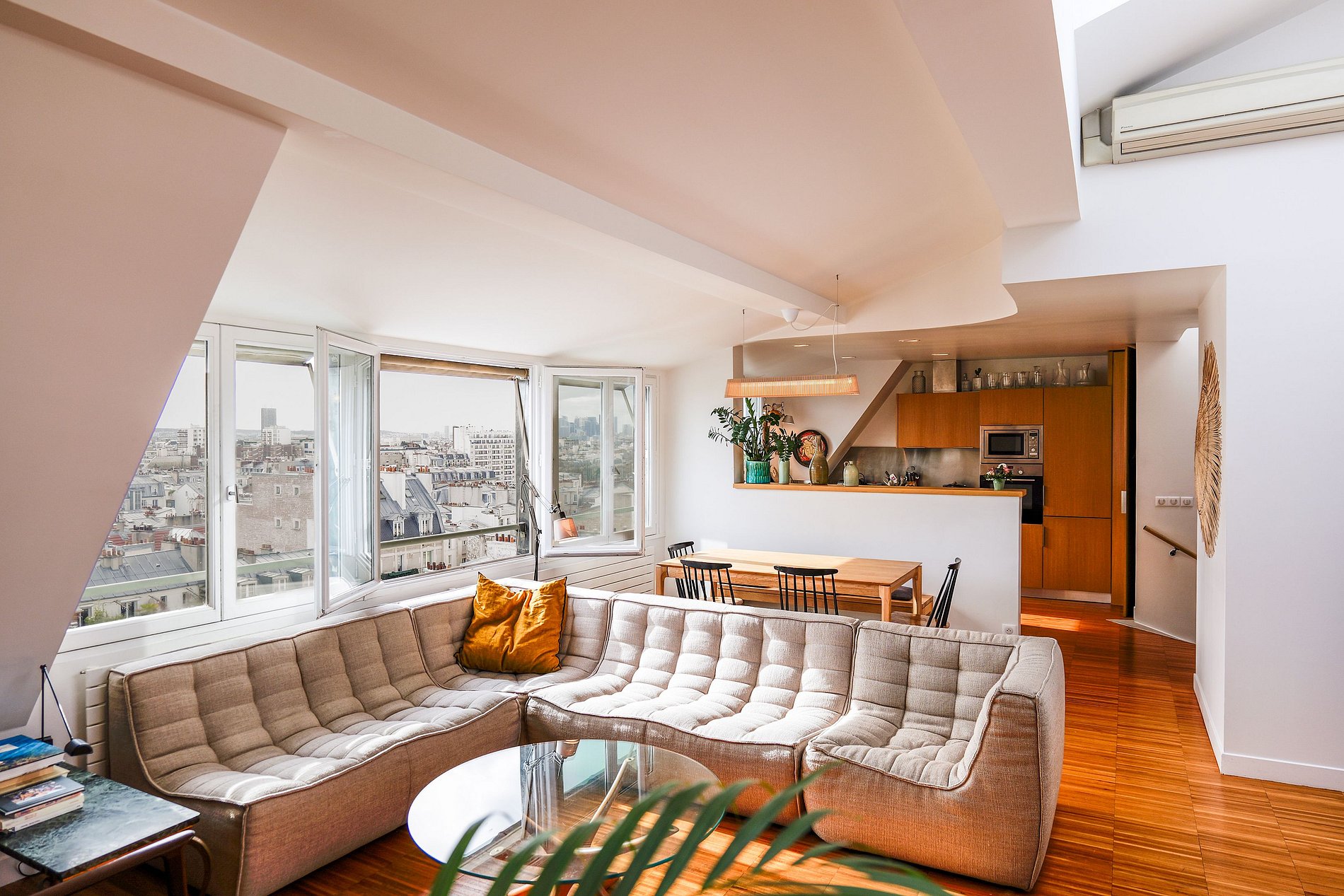 Niché dans le quartier des Batignolles, ce triplex de 120 m2 offre un cadre de vie exceptionnel sur les hauteurs de Paris. Réparti sur les 7ème, 8ème et 9ème étages, l'appartement dévoile des vues à couper le souffle sur les toits de la ville lumière et ses monuments emblématiques.