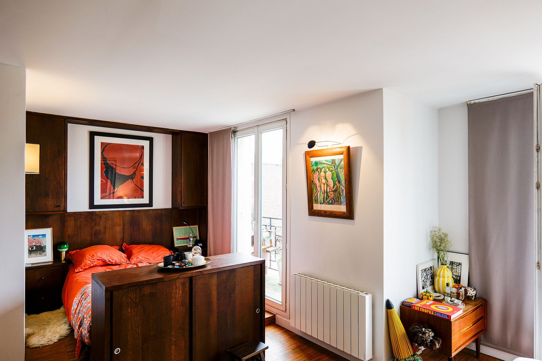 Au 7ème étage, un studio indépendant avec son balcon-terrasse invite à profiter d'un petit déjeuner en surplombant les toits de Paris, offrant ainsi une expérience unique.