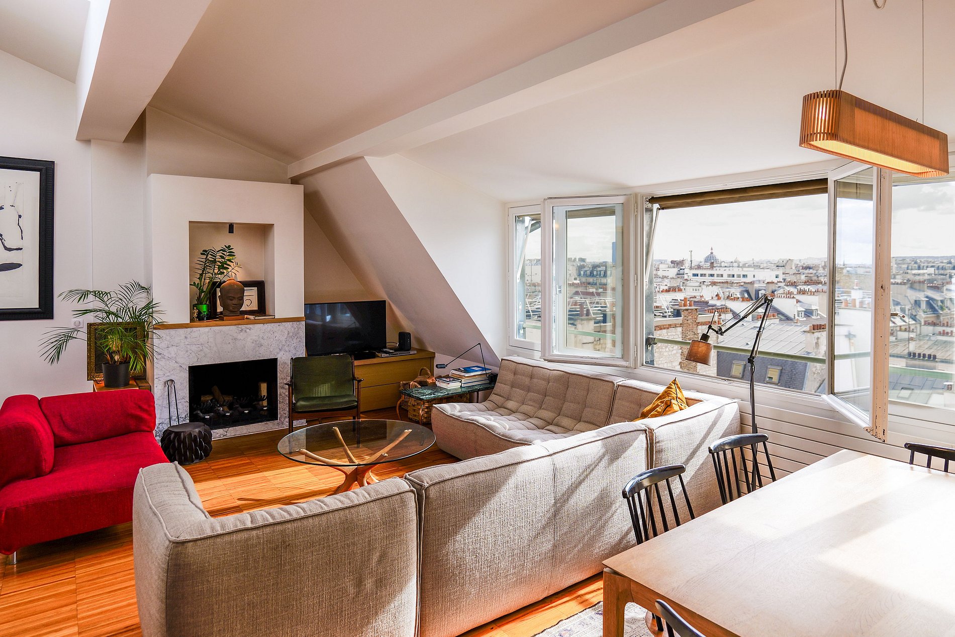 Un escalier élégant mène au 9ème étage, où une vigie vitrée sur les côtés et au-dessus offre une vue panoramique à couper le souffle sur tout Paris. Ce perchoir unique permet d'admirer la ville sous un nouvel angle, faisant de cet appartement un véritable joyau au cœur de la capitale française.