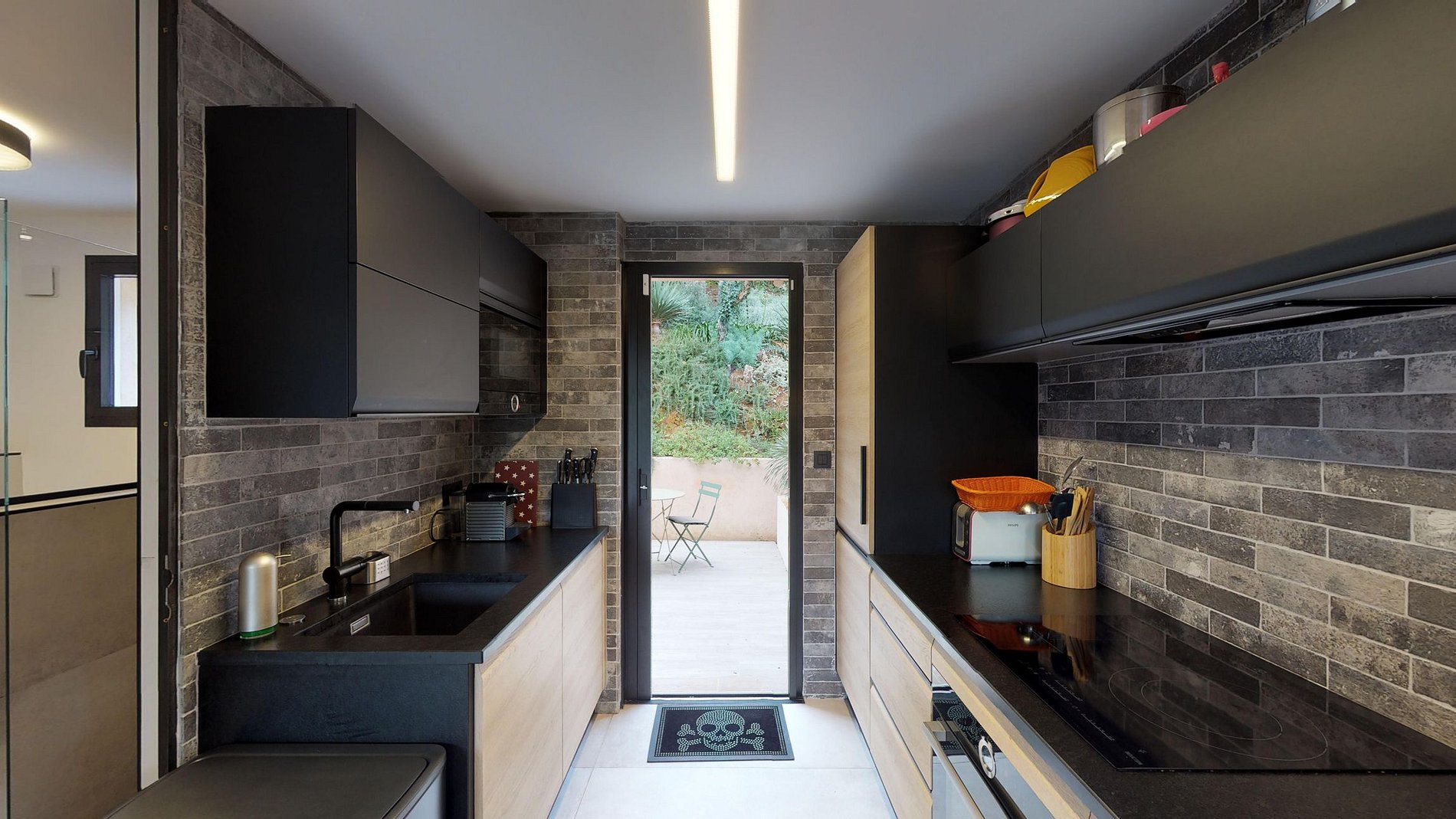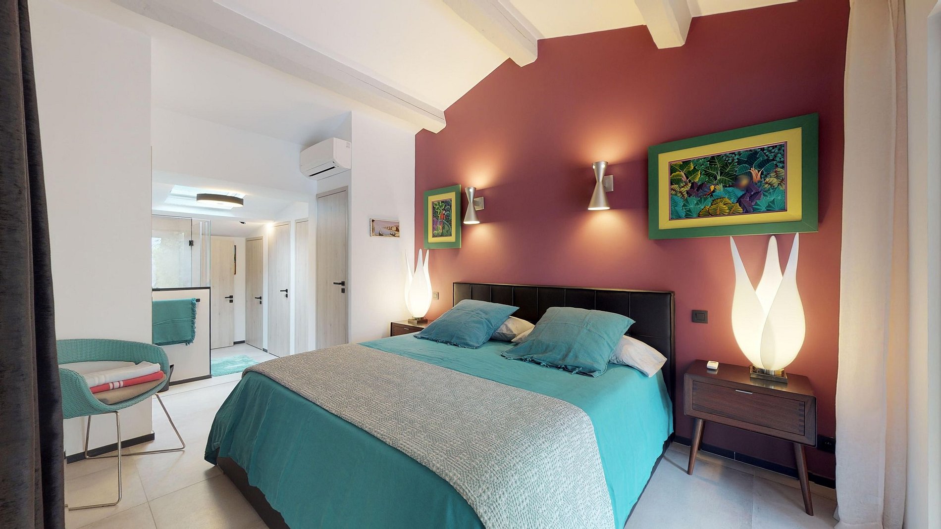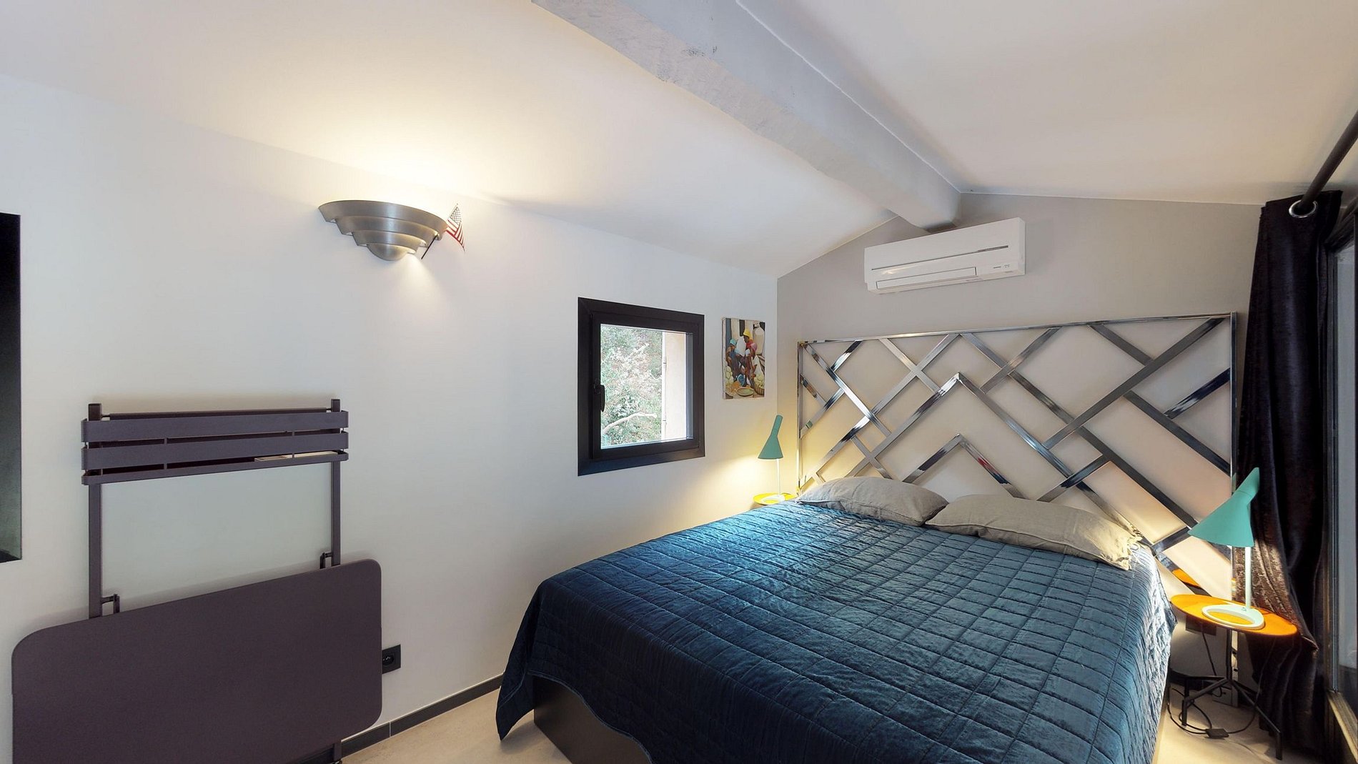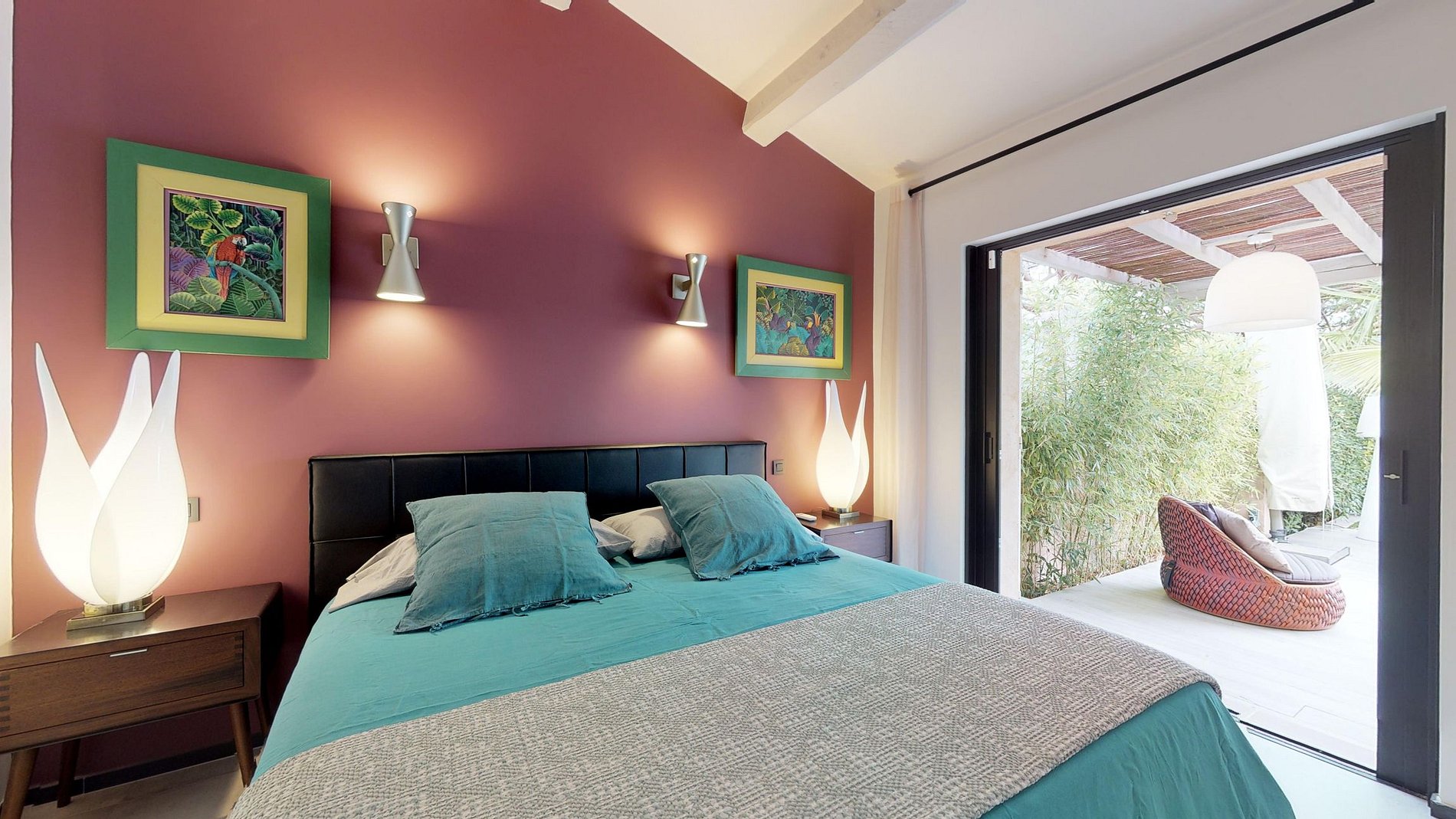 Ce loft comprend deux chambres, chacune ouverte sur le séjour avec des baies vitrées, une cuisine entièrement équipée, une piscine privée et un espace barbecue.
