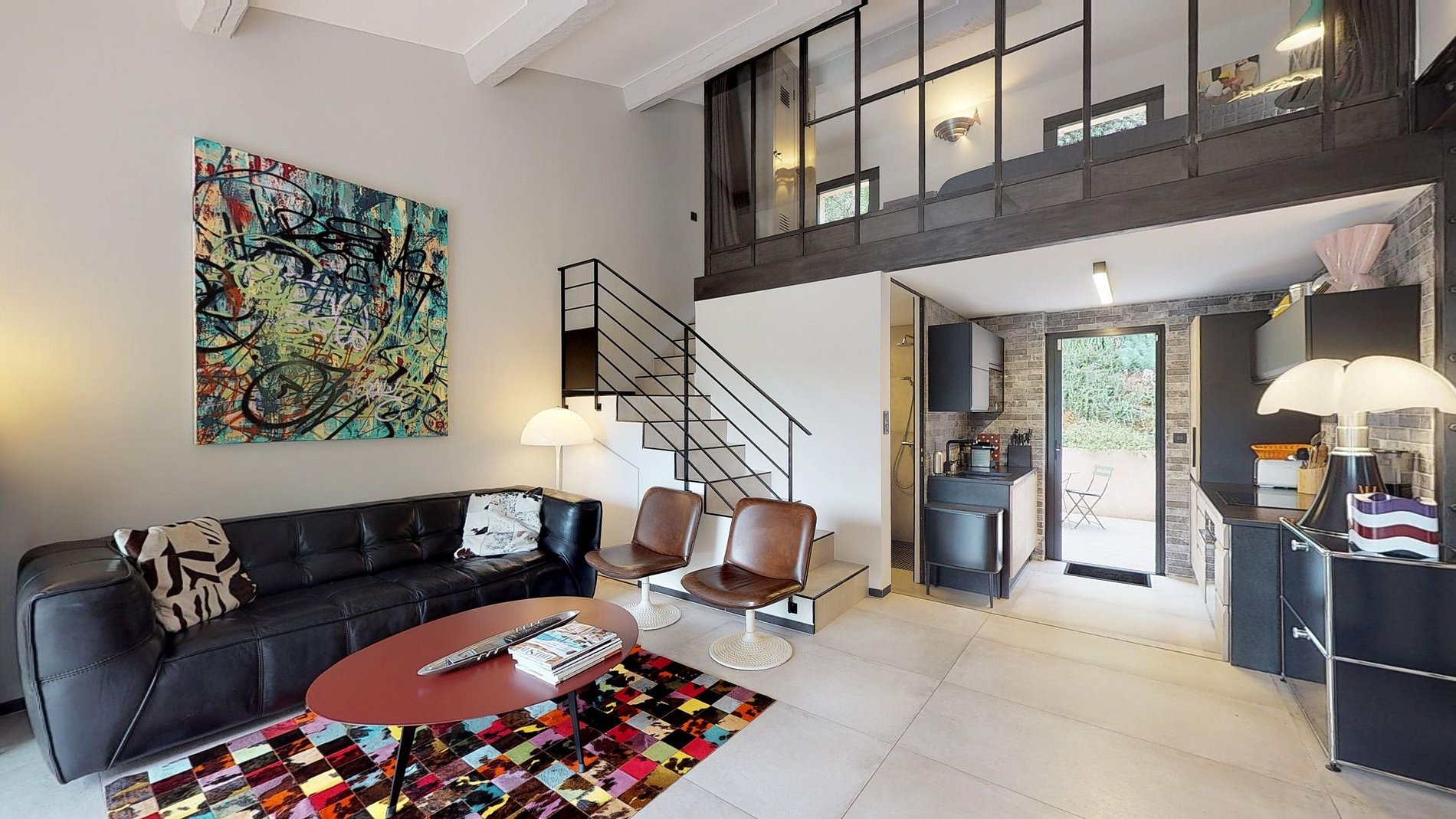 Ce loft comprend deux chambres, chacune ouverte sur le séjour avec des baies vitrées, une cuisine entièrement équipée, une piscine privée et un espace barbecue.