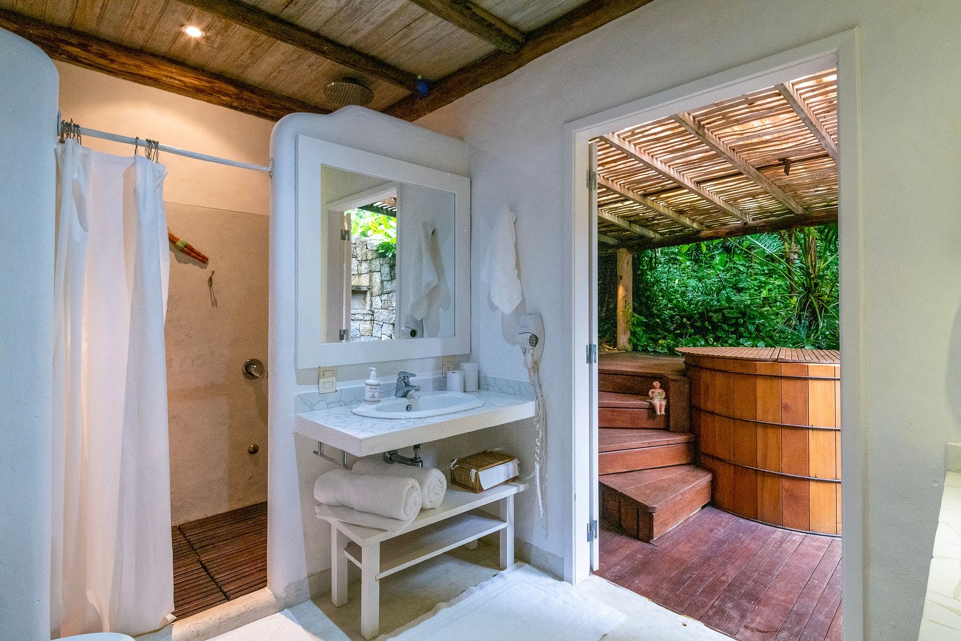 L'hébergement de la villa comprend une villa principale avec une annexe attenante et deux suites parentales séparées. Ensemble, la villa principale et l'annexe attenante de la villa forment un total de suites 5. Les deux suites principales séparées disposent d'un salon et de leur propre bain à remous privé ou d'un bain à remous japonais en bois.