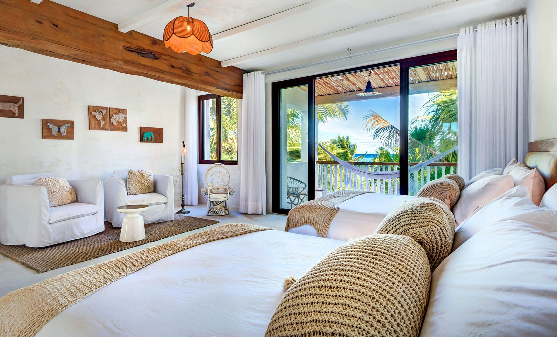 En montant à l'étage, 5 suites au design unique vous accueillent. Chaque suite dispose de sa propre salle de bains, d'un lit king-size et d'une terrasse privée avec vue sur l'océan.