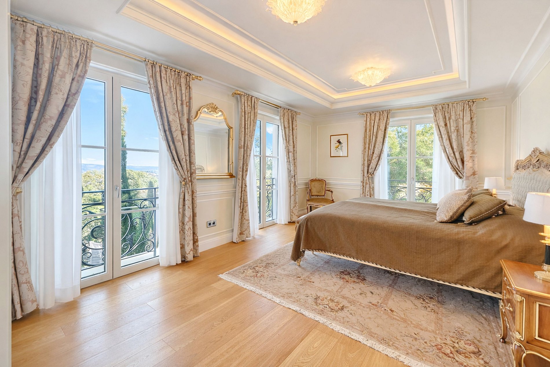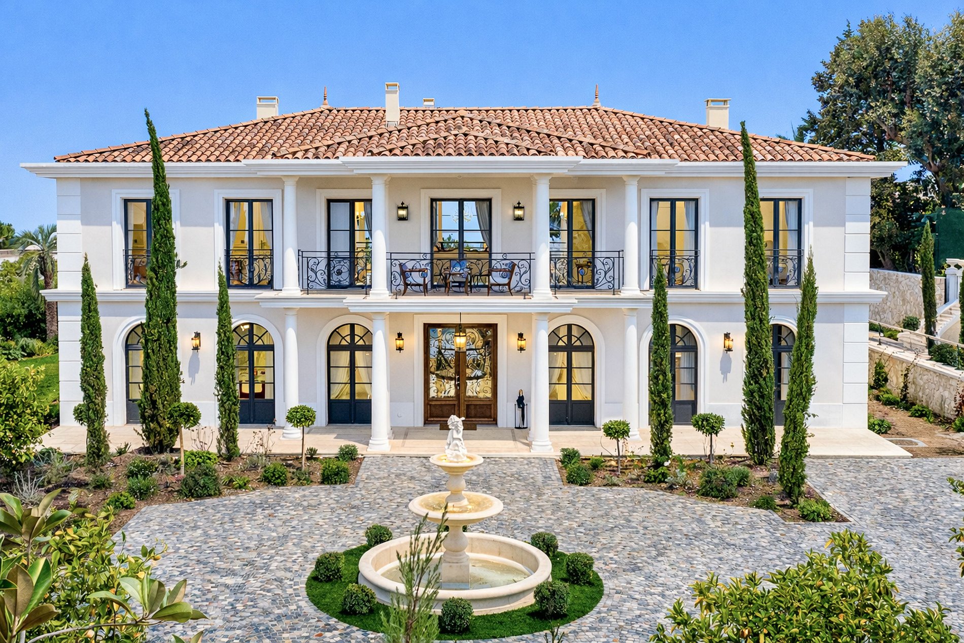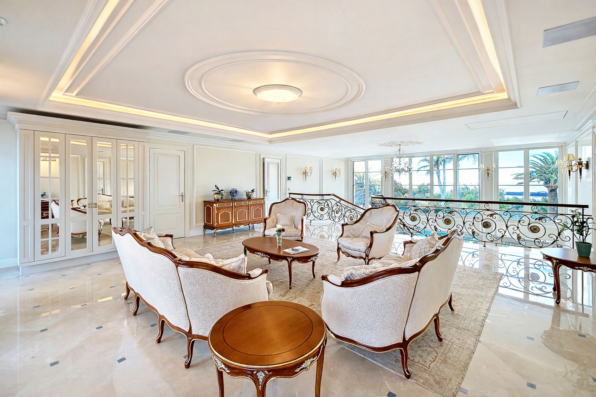Dès l’entrée, le ton est donné : volumes spectaculaires, escalier monumental en fer forgé, marbres nobles, lustres majestueux et finitions d’un raffinement extrême. Les espaces de réception s’ouvrent sur une vaste terrasse plein sud avec une vue imprenable sur la mer, la baie du Cap d’Antibes et les îles de Lérins.