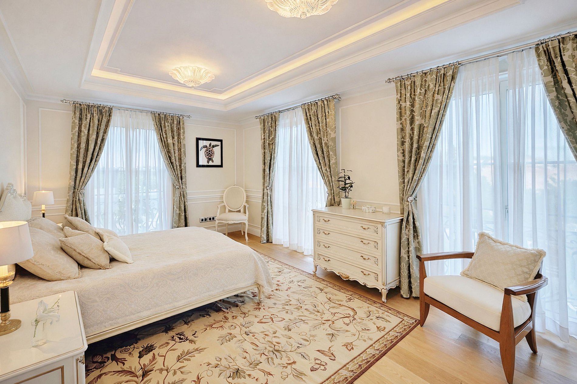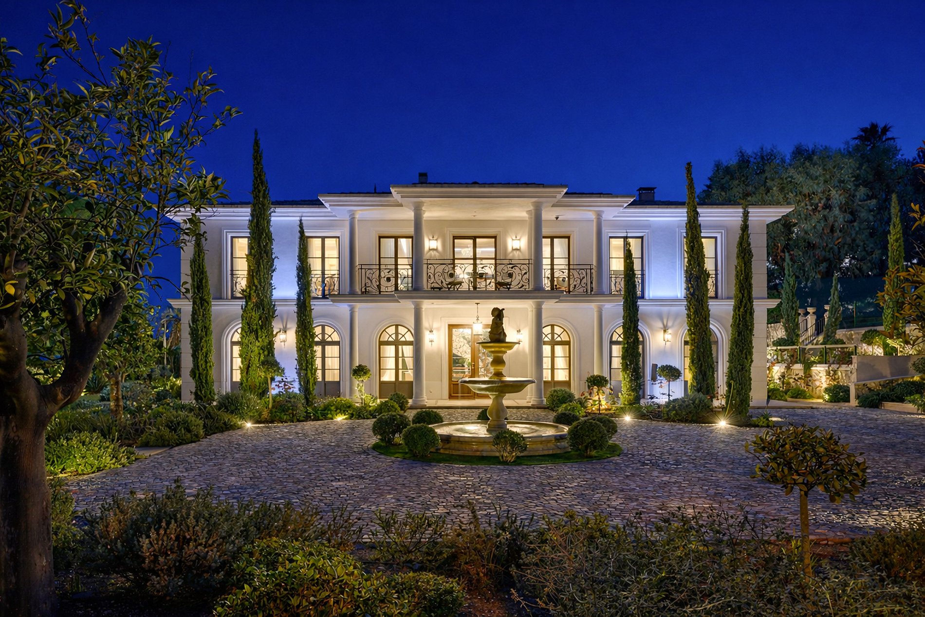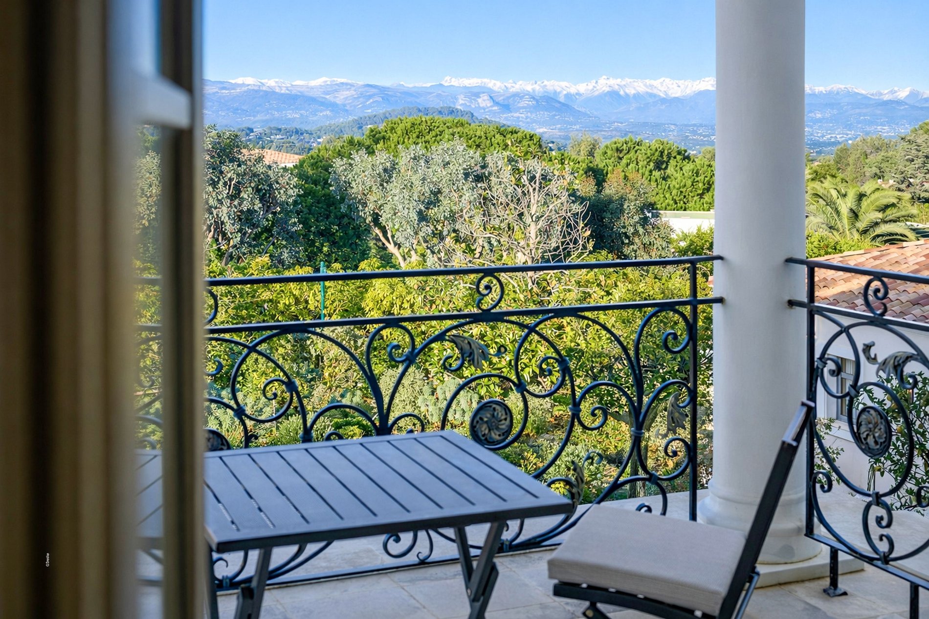 Dès l’entrée, le ton est donné : volumes spectaculaires, escalier monumental en fer forgé, marbres nobles, lustres majestueux et finitions d’un raffinement extrême. Les espaces de réception s’ouvrent sur une vaste terrasse plein sud avec une vue imprenable sur la mer, la baie du Cap d’Antibes et les îles de Lérins.