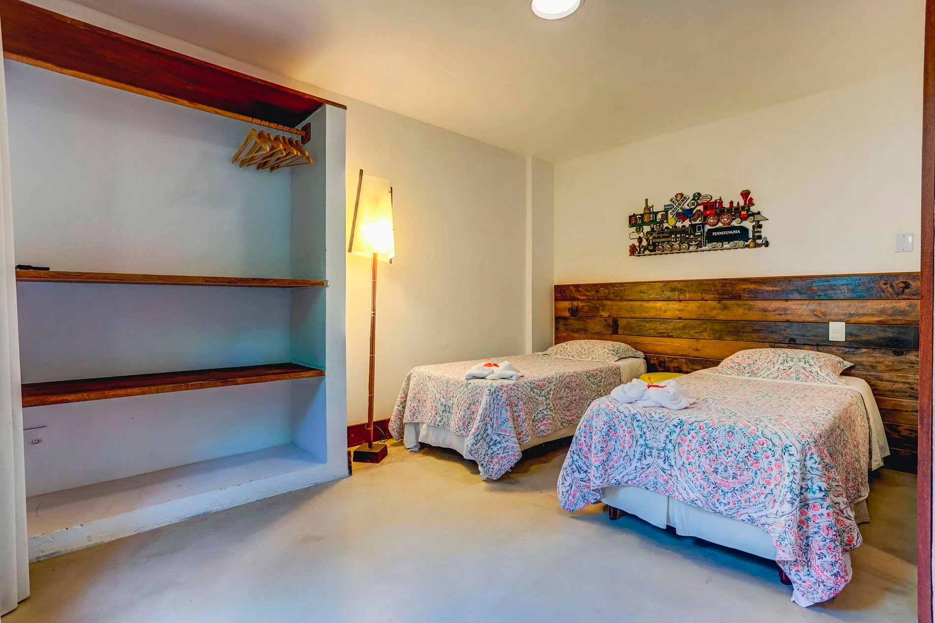 L'étage supérieur avec trois suites bien agencées avec : climatisation, placards, télévision, lampe. Fenêtres avec une vue verte. Et salle de bain avec placard et sèche-cheveux.