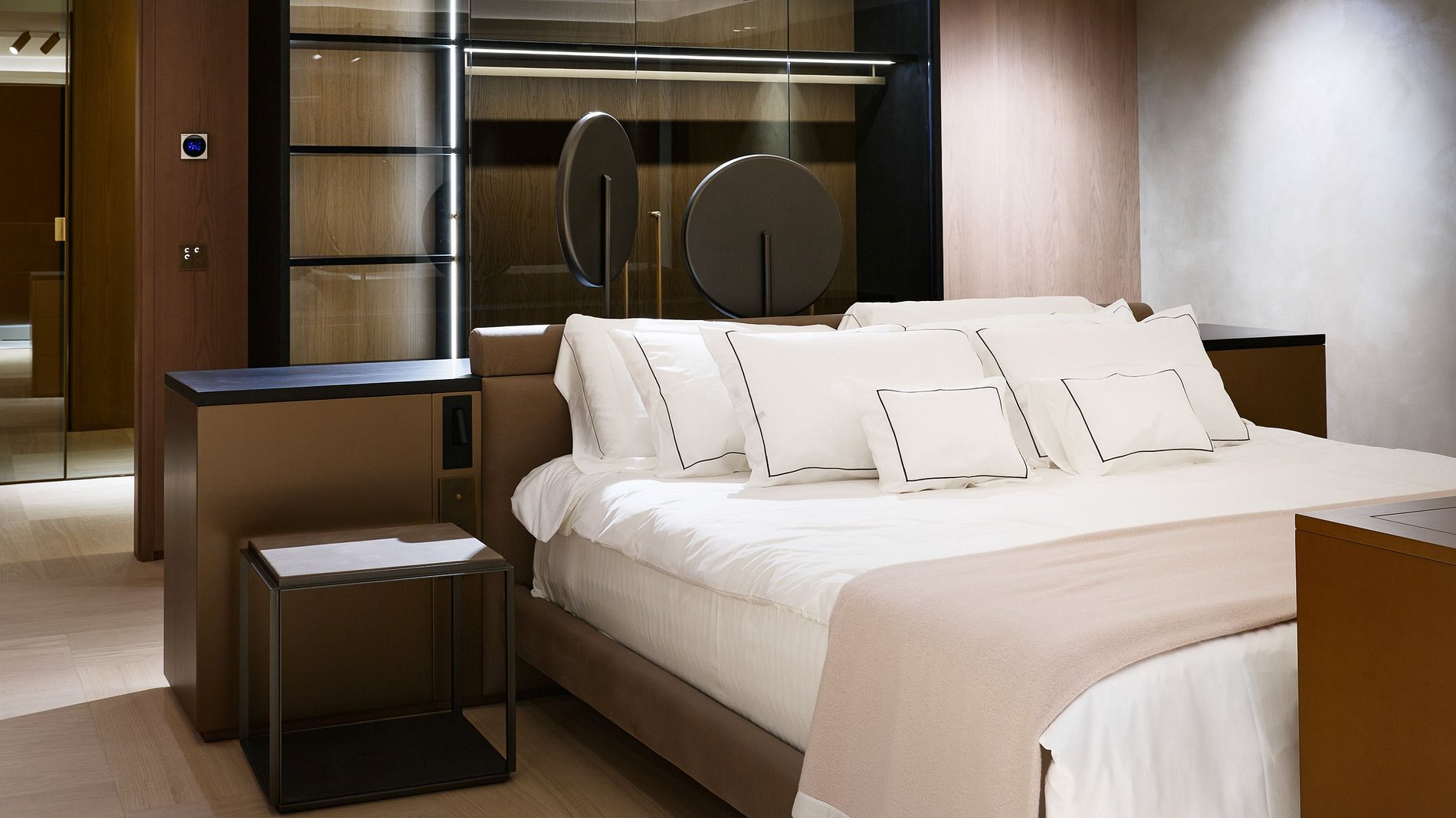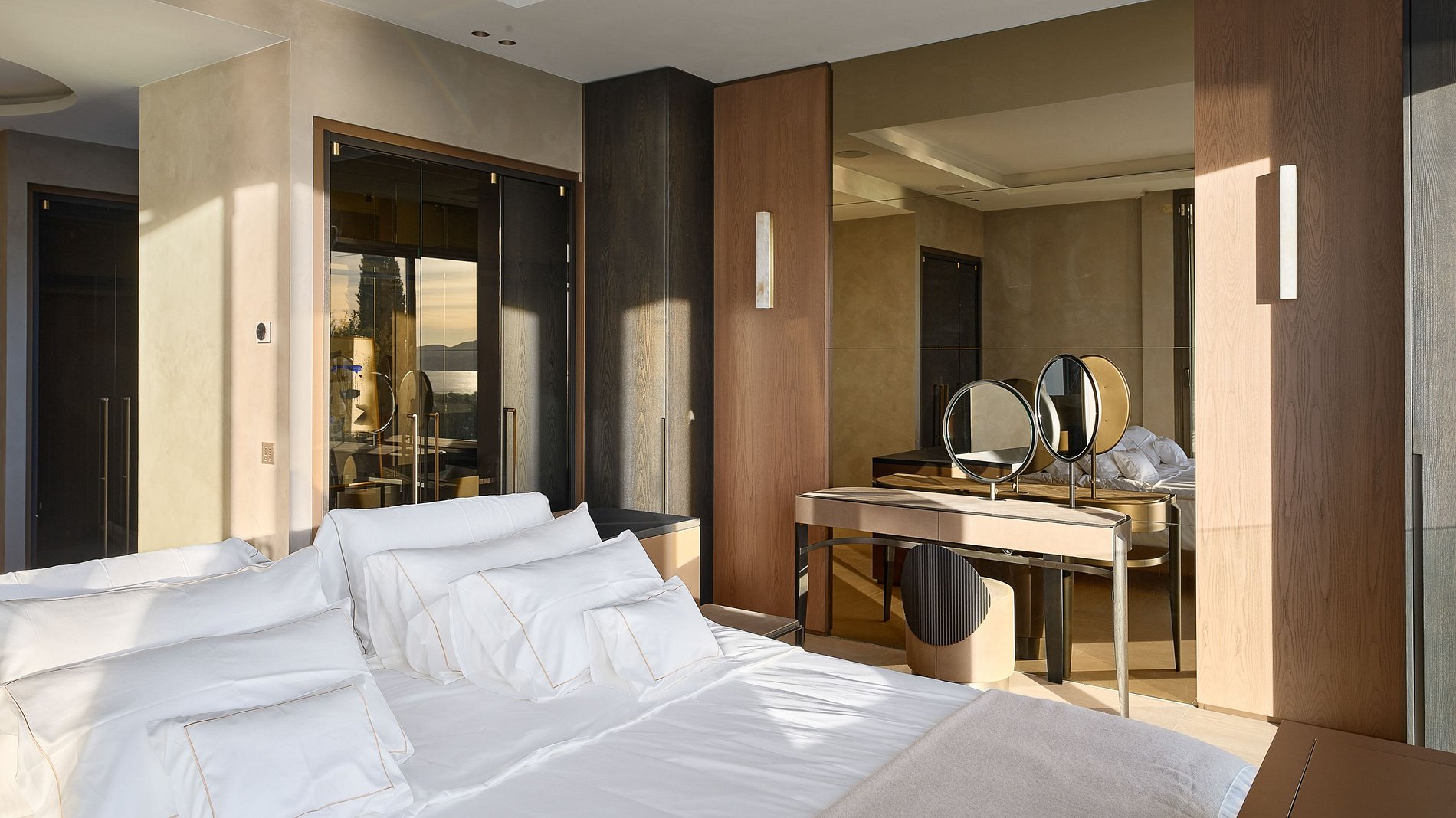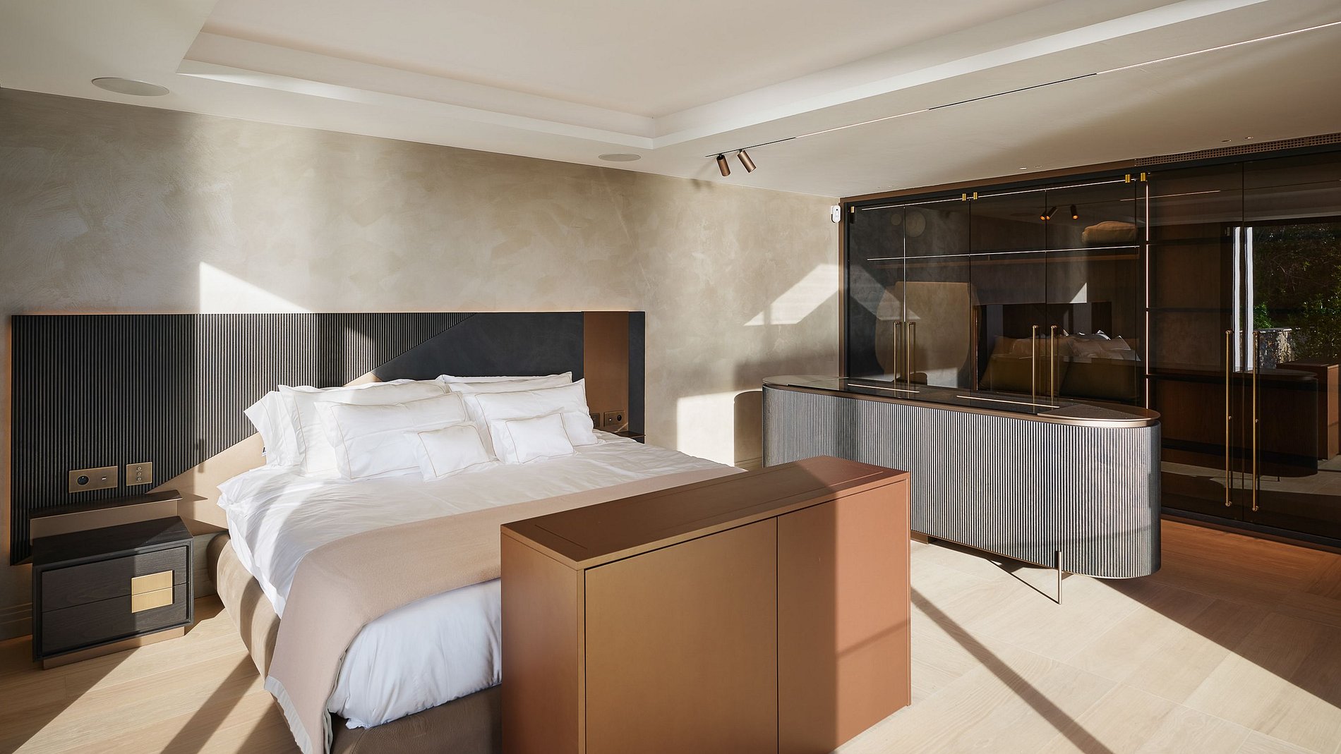 La villa dispose d’environ 600 m² d’espaces intérieurs et peut accueillir jusqu’à 12 invités répartis dans 6 chambres, dont plusieurs avec salle de bains privative équipée de baignoire, double vasque et équipements haut de gamme. Les intérieurs allient une esthétique moderne et raffinée avec des tons gris et blancs qui contrastent élégamment avec le bleu profond de la mer.