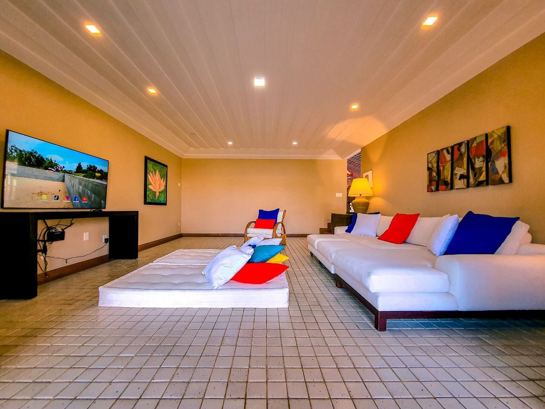Cette propriété extraordinaire dispose de 3 salons, 1 salle à manger, 1 salle de télévision, balcon gastronomique avec terrasse et barbecue complet, piscine, sauna, 5 suites, avec 8 salles de bain au total, ainsi qu'une cuisine entièrement équipée, pouvant accueillir confortablement jusqu'à 14 convives. Toutes les chambres sont équipées de climatisation, de placards et de linge de lit et de bain.
