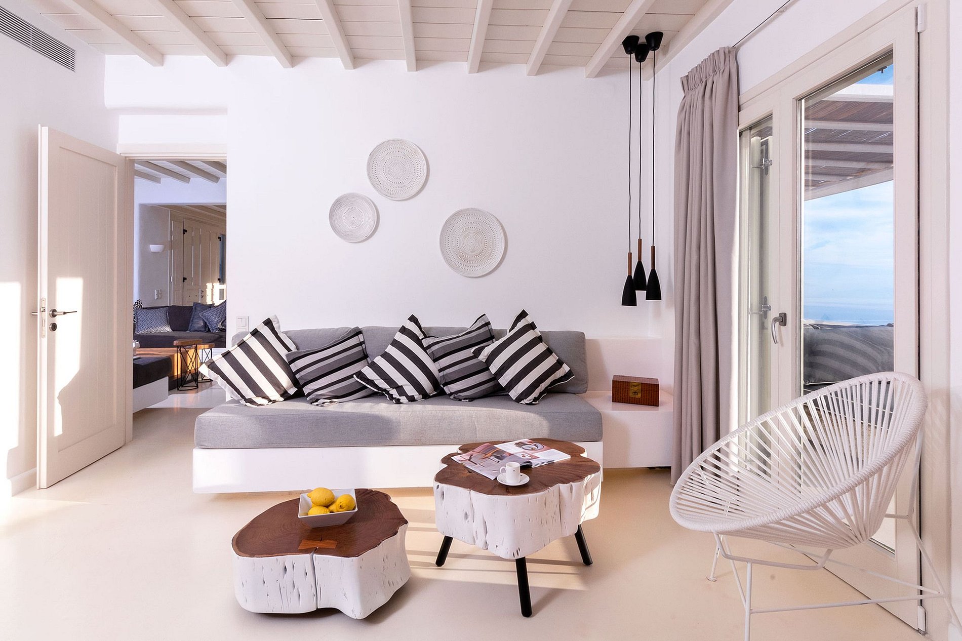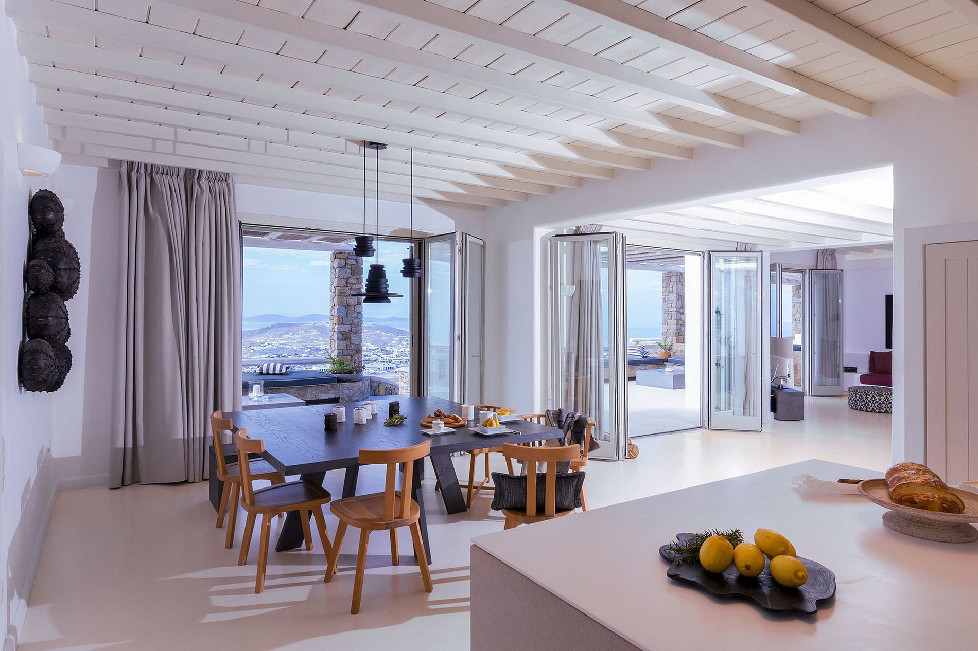 La villa est superbement située au sommet d'une colline surplombant la mer Égée et les îles des Cyclades. Elle peut accueillir jusqu'à 6 personnes dans 3 chambres (2 masters avec salles de bains et une chambre séparée) d'une superficie totale de 240m2. La suite principale a une vue panoramique sur Mykonos. Séjour élégant et confortable avec coin repas, cuisine entièrement équipée, WC, cheminée et jacuzzi intérieur. Une incroyable piscine à débordement avec jacuzzi et éclairage à fibre optique magnifie l'élégant coin repas et le salon extérieur.