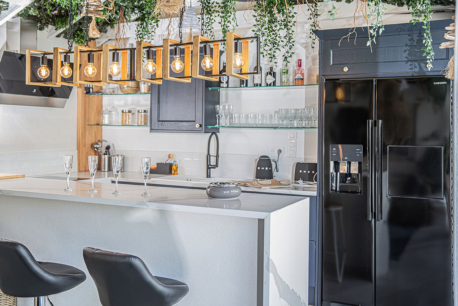 La villa dispose d'un grand coin cuisine qui comprend une cuisinière à gaz à 6 feux avec un triple four. Un réfrigérateur à vin accompagne un réfrigérateur / congélateur de style américain de premier plan, et il y a aussi un petit réfrigérateur à boissons sur le toit-terrasse. Les espaces de vie s'ouvrent sur la piscine offrant un espace ouvert, équipé de téléviseurs 75 pouces dans le salon.