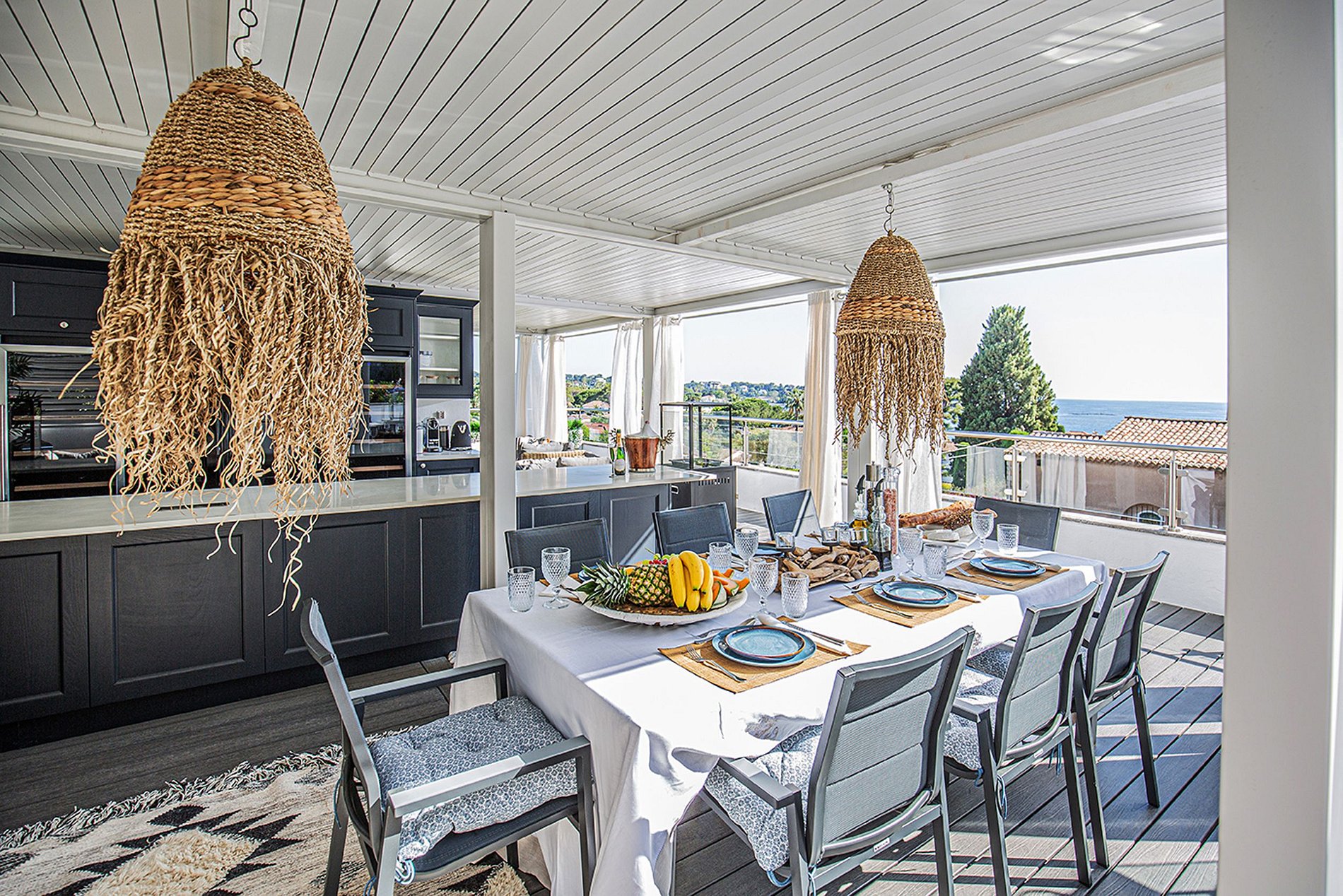 Le toit-terrasse offre une vue imprenable sur le Cap d'Antibes et un espace bar équipé d'un réfrigérateur et d'un évier. La zone de bain suntrap et la table à manger sont situées avec un coin salon avec un toit ombragé. Le site dispose d'un éclairage d'ambiance pour créer une belle ambiance pour les repas du soir. Il y a aussi un barbecue à gaz à disposition des clients.