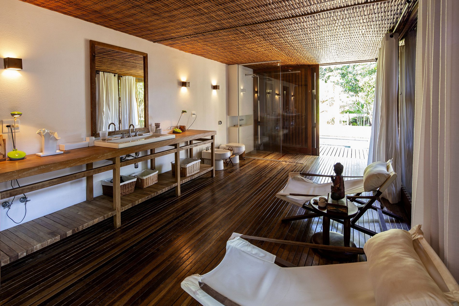L'un des nombreux points forts de la propriété est la piscine moderne, qui repose en partie sous un solarium conçu par Bahian. Avec une entrée unique conçue de l'intérieur du bâtiment à la piscine, le confort de l'intérieur et la nature inédite semblent se confondre. Il y a aussi une immense terrasse en bois tropical, ce qui ne peut être meilleur endroit pour se détendre sous le soleil de Bahian.