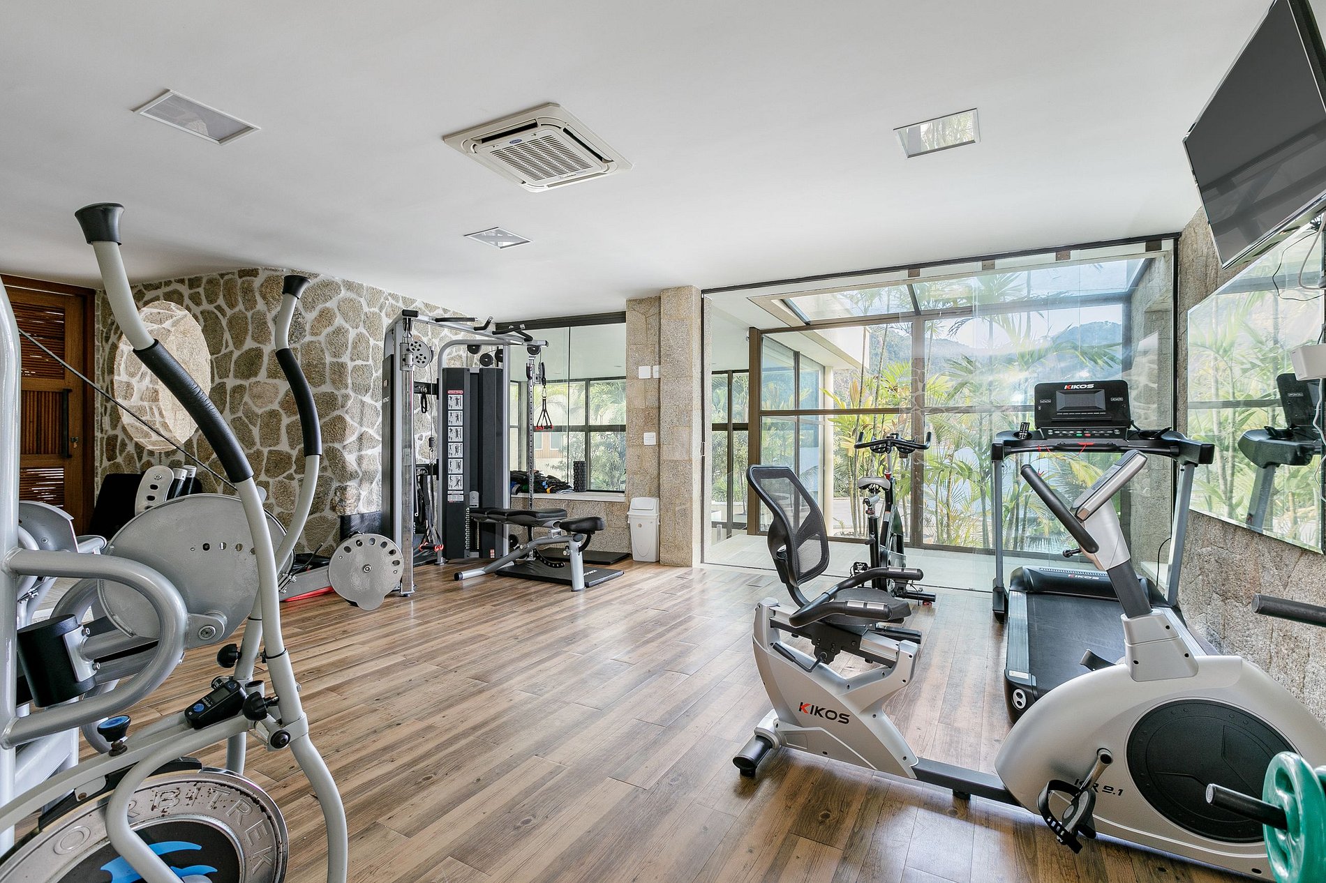Pour ceux qui apprécient le bien-être physique, une salle de sport privée est à votre disposition, vous permettant de maintenir votre routine d'exercice même pendant vos vacances. La piscine surplombant la mer, située à côté de la bande de sable de sa plage privée, est une invitation irrésistible à profiter de moments de détente tout en admirant les beautés naturelles qui vous entourent.