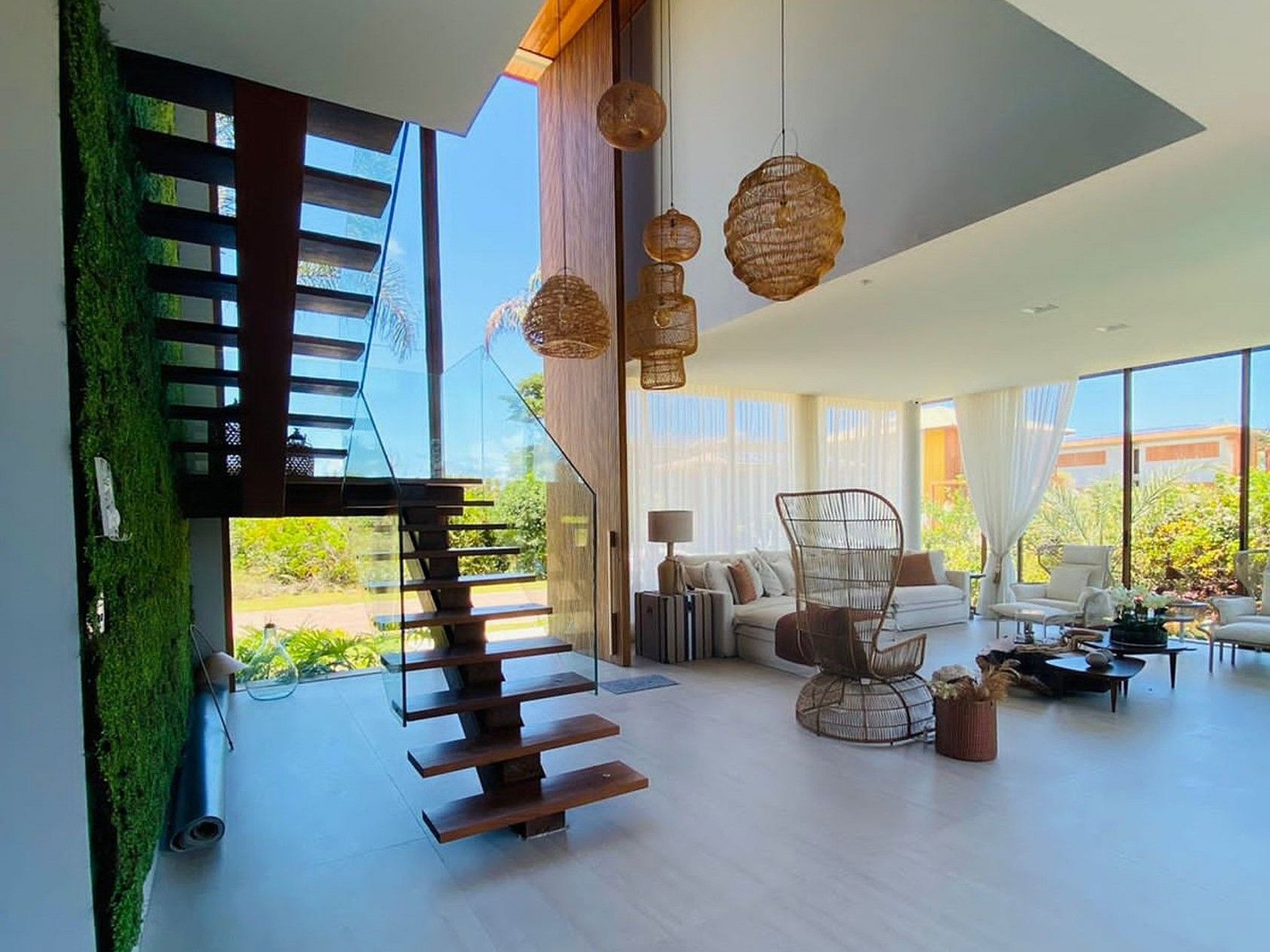 Cette fabuleuse villa à 2 étages impressionne dès sa façade. Avec un beau jardin, deux palmiers placés de part et d'autre de la grande porte pivotante ; qui donne accès à l'intérieur de la villa. Conçue dans un concept à aire ouverte, la villa tire un excellent parti de l'éclairage naturel, ainsi que des vents côtiers qui génèrent une climatisation naturelle même par temps chaud.