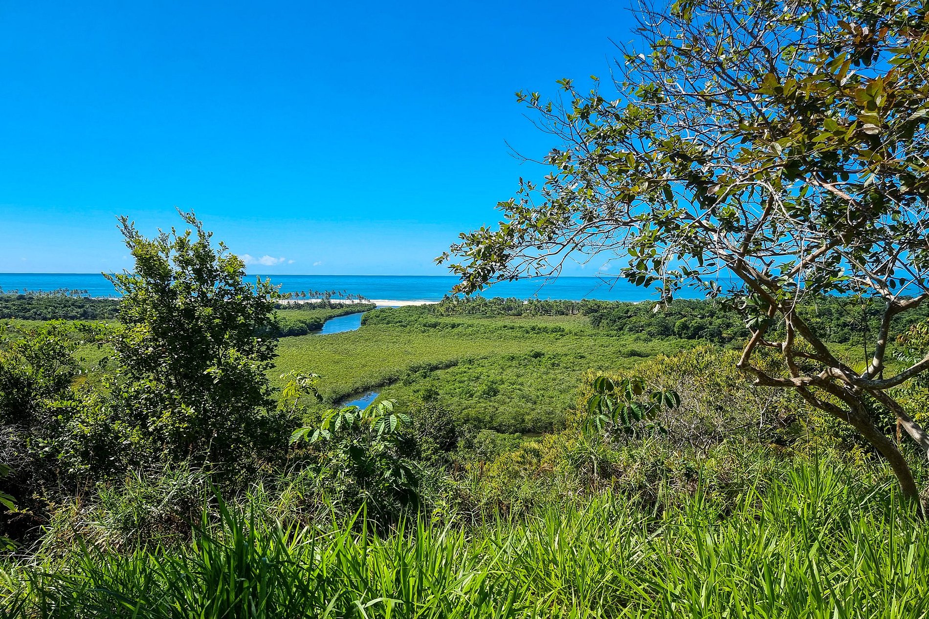 Une belle rivière traverse la forêt vierge et la mangrove jusqu’à ce qu’elle se confonde avec les eaux de la mer bleue, générant un endroit unique à explorer.La rivière a une belle cascade, propice à la baignade.La longue piscine de 25 mètres offre une vue imprenable sur l'horizon plein de verdure, les plages et des bleus de la mer et du ciel.Les imposantes terrasses et decks de bois disposent de confortables chaises longues, de canapés et de chaises sculptés dans de vieux canoës.