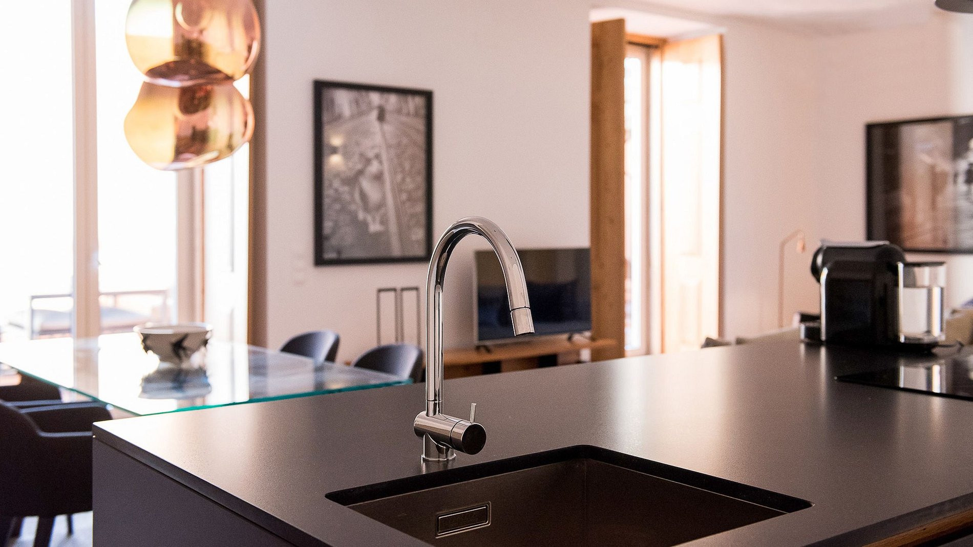 La cuisine spacieuse dispose d'un réfrigérateur rempli de friandises de bienvenue, les croissants fraîchement sortis du four livrés à votre porte tous les jours.
