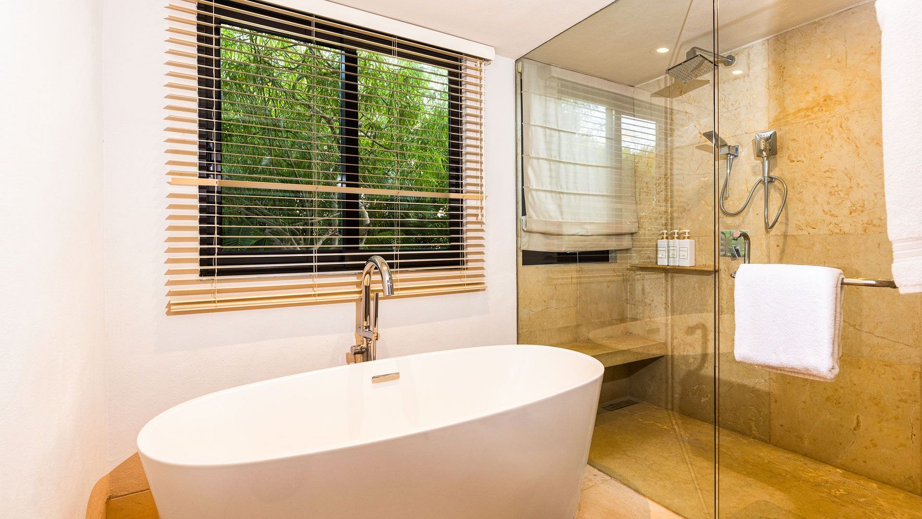 La villa comprend quatre chambres, toutes avec salle de bain privative, agencées pour offrir à la fois intimité et accès facile aux espaces communs. Les configurations incluent des lits king et queen, idéales pour les familles ou petits groupes.