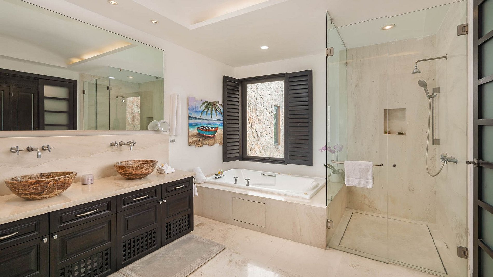 La villa peut accueillir jusqu’à huit personnes dans quatre chambres, toutes avec salle de bain privative. La configuration comprend une suite avec lit king, une chambre avec lit queen, une chambre avec deux lits doubles et une chambre avec deux lits simples, idéale pour les familles ou petits groupes.