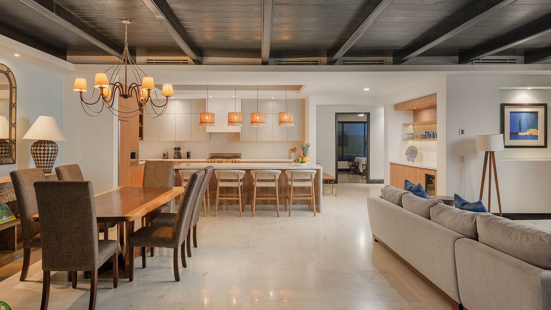 L’intérieur présente un agencement ouvert reliant salon, salle à manger et cuisine, agrémenté de mobilier au style traditionnel et de finitions chaleureuses. De larges baies vitrées permettent à la lumière naturelle d’inonder les espaces, créant une transition fluide entre intérieur et extérieur.