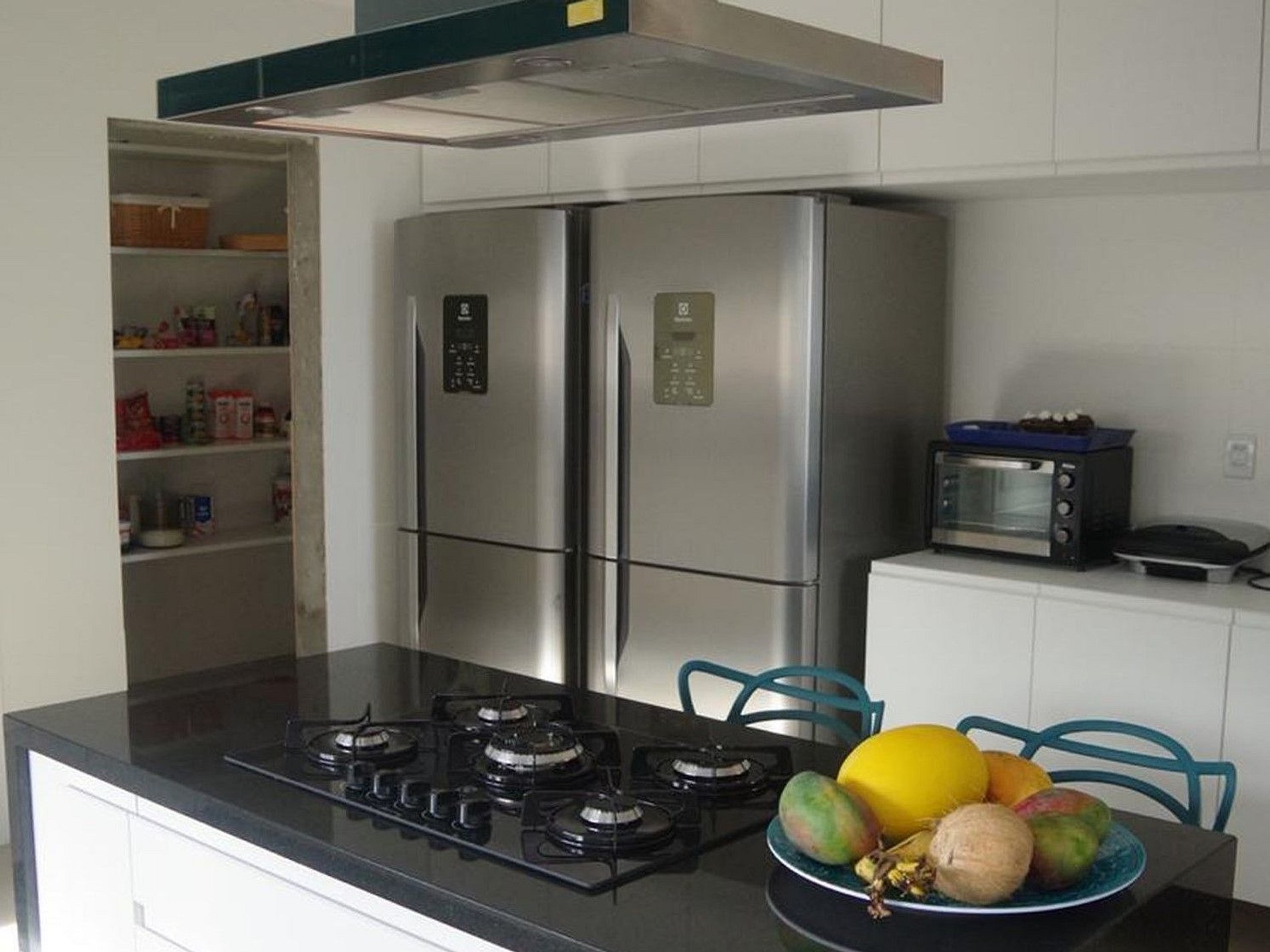 En montant les escaliers, il y a une petite salle de télévision, avec un canapé en cuir escamotable. Et un banc de bureau. Il y a aussi 03 suites complètes, avec split, placard et lit queen size avec lits superposés. La suite principale super spacieuse dispose d'un lit king size, d'un bureau, d'un minibar, d'un placard et de 02 douches. De cette façon, la villa accueille très bien 18 personnes. Un spectacle!