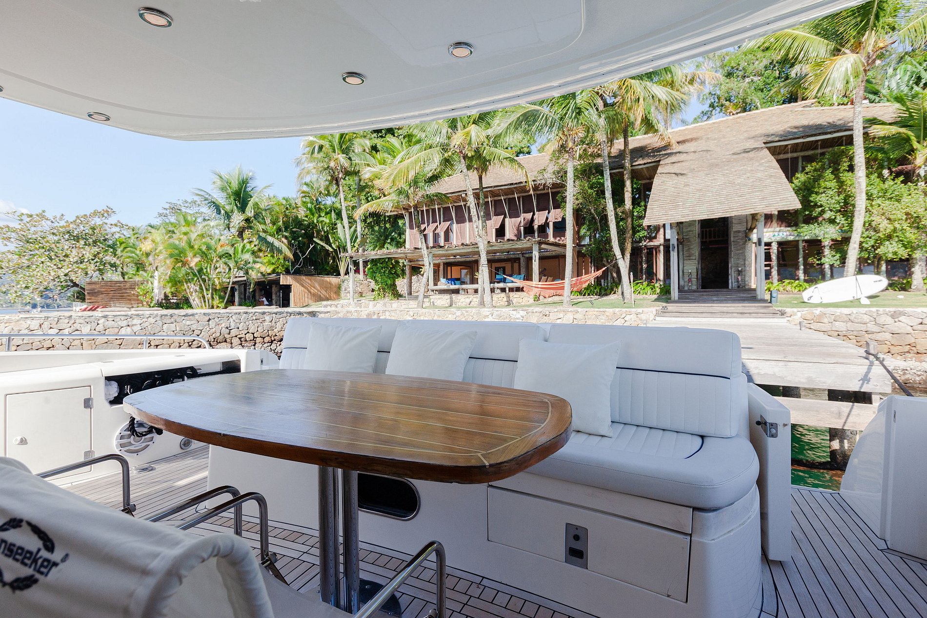 L'île dispose de 24 heures de sécurité et d'un hors-bord de 76 pieds disponible à la location pour R$ 13,750/jour pour un minimum de 3 nuits.