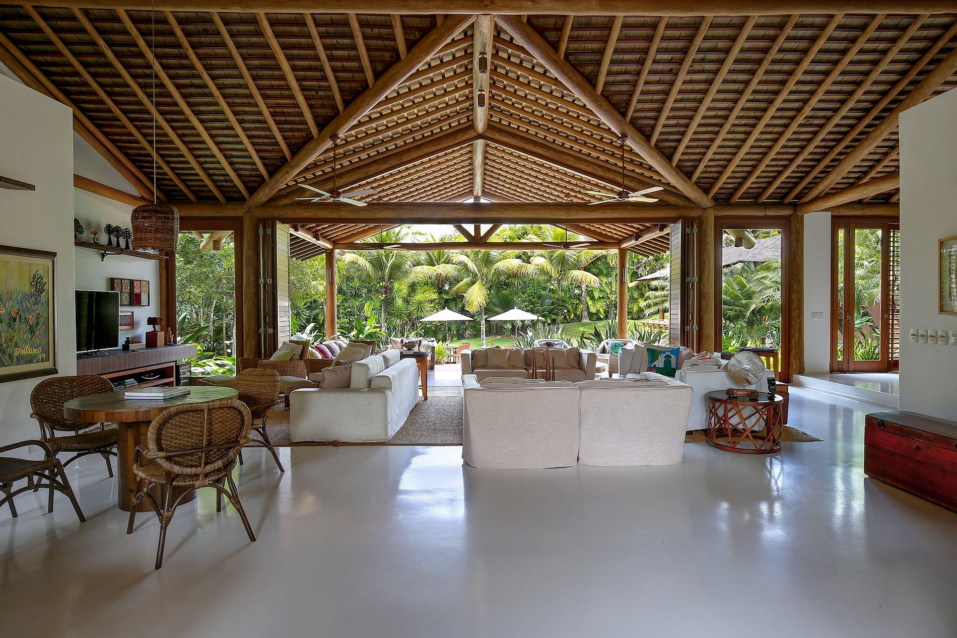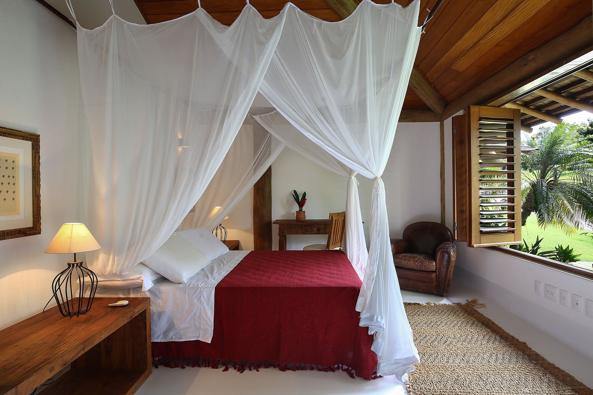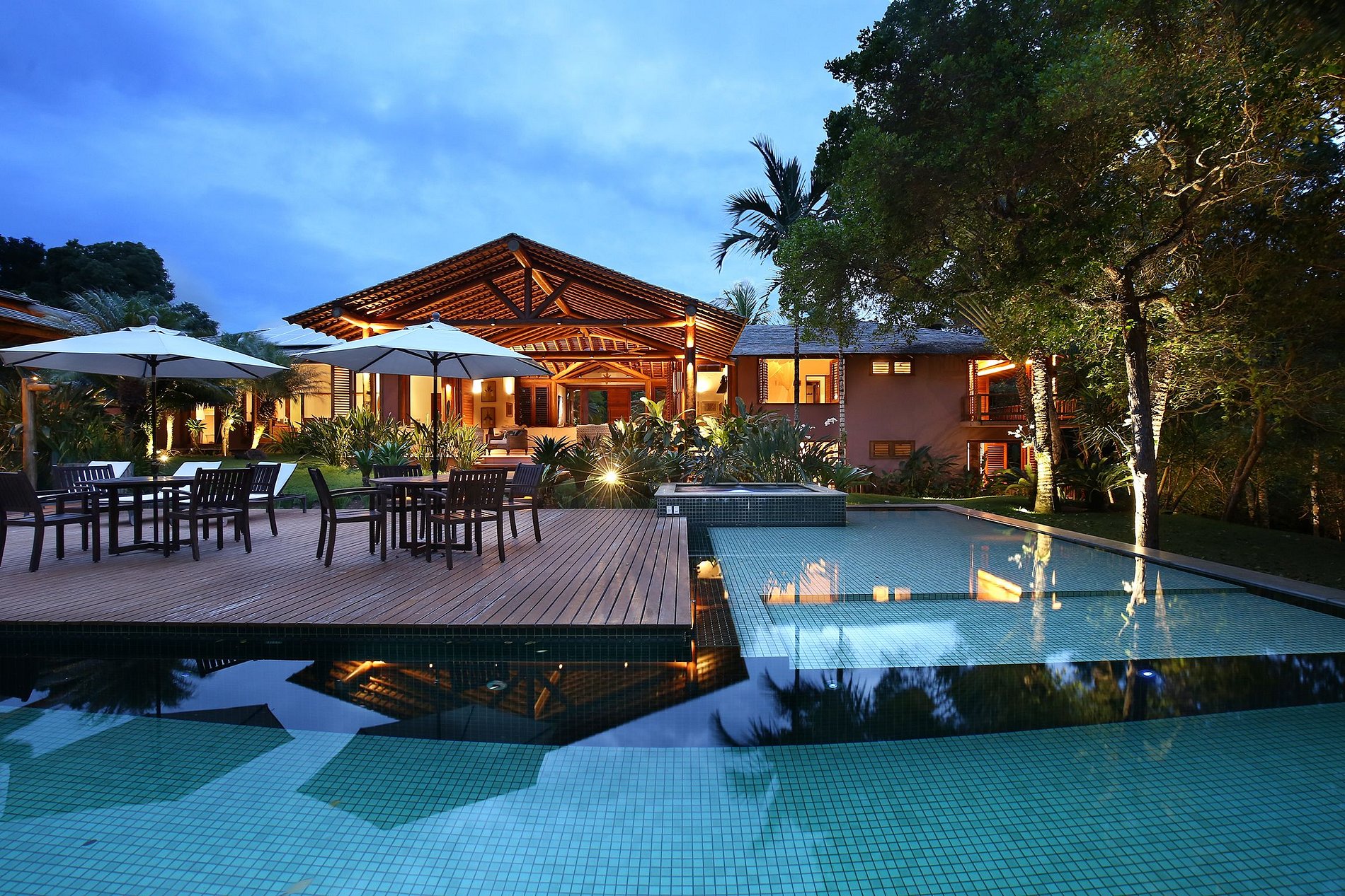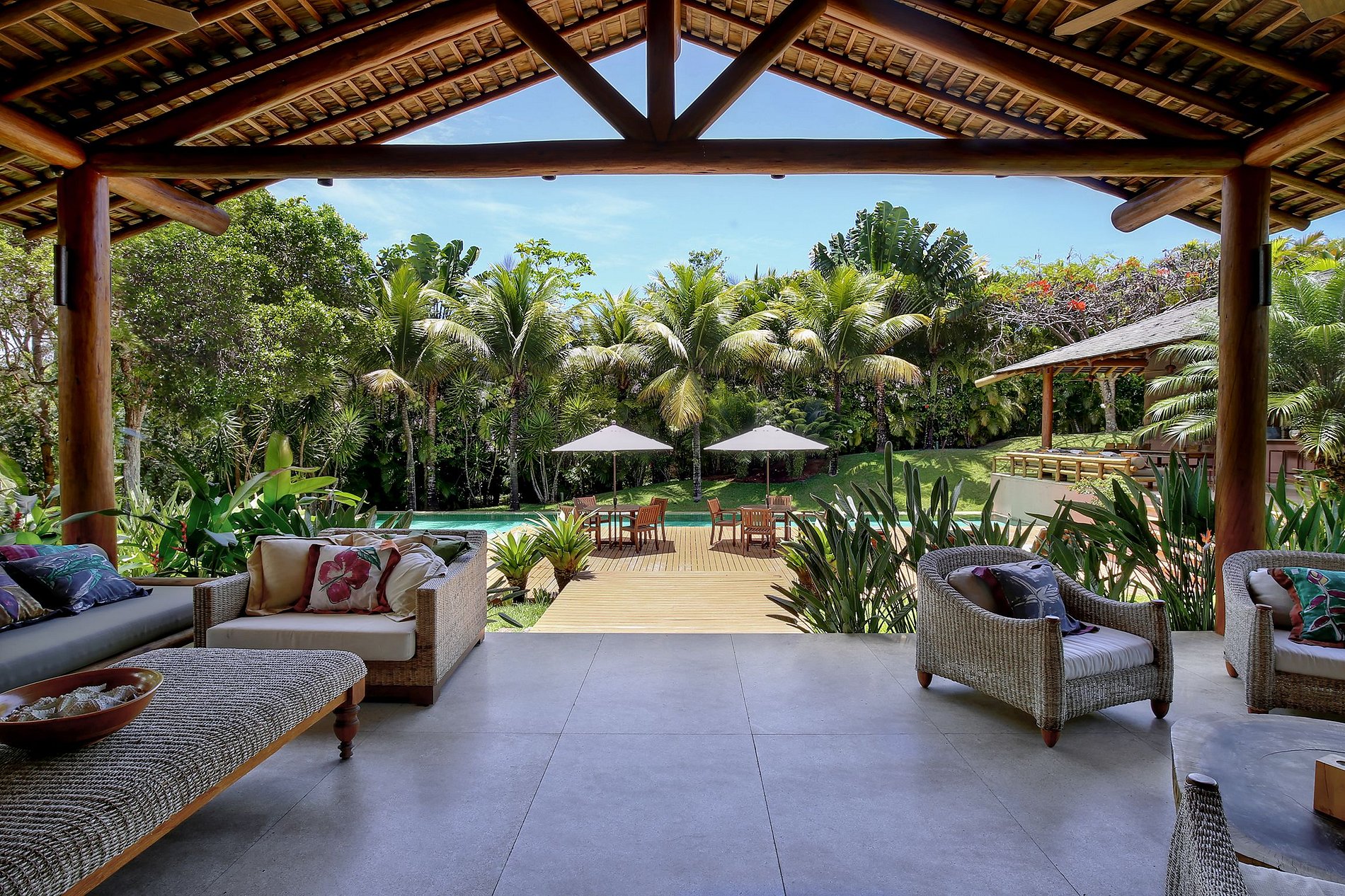 Il y a une immense piscine, une magnifique terrasse en bois avec des chaises longues et des hamacs confortables, un coin repas extérieur avec barbecue, un jardin luxuriant avec des plantes exotiques et de grands plamtrees et un luxueux jacuzzi dans lequel vous pourrez prendre un verre, atmosphère unique de la propriété. La villa de style typiquement bahianais a été conçue pour la transition parfaite entre la beauté de la nature de l’espace extérieur et la luxure de l’intérieur.