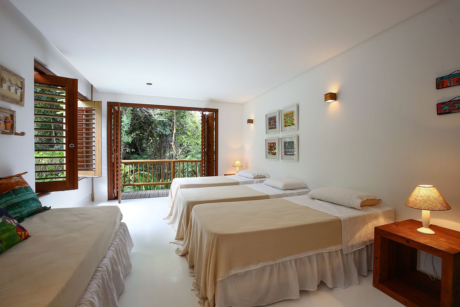 Il y a 3 autres suites au premier étage, deux d'entre elles avec des lits queen size, une avec trois lits simples, parfaite pour les enfants. Les deux autres suites sont situées au rez-de-chaussée, l'une d'entre elles possède trois lits (deux lits doubles et un lit simple) et a un accès direct à la varanda, l'autre est dotée d'un lit queen-size.