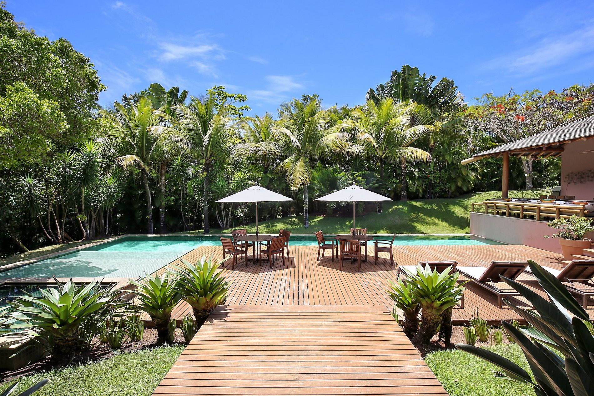 Il y a une immense piscine, une magnifique terrasse en bois avec des chaises longues et des hamacs confortables, un coin repas extérieur avec barbecue, un jardin luxuriant avec des plantes exotiques et de grands plamtrees et un luxueux jacuzzi dans lequel vous pourrez prendre un verre, atmosphère unique de la propriété. La villa de style typiquement bahianais a été conçue pour la transition parfaite entre la beauté de la nature de l’espace extérieur et la luxure de l’intérieur.