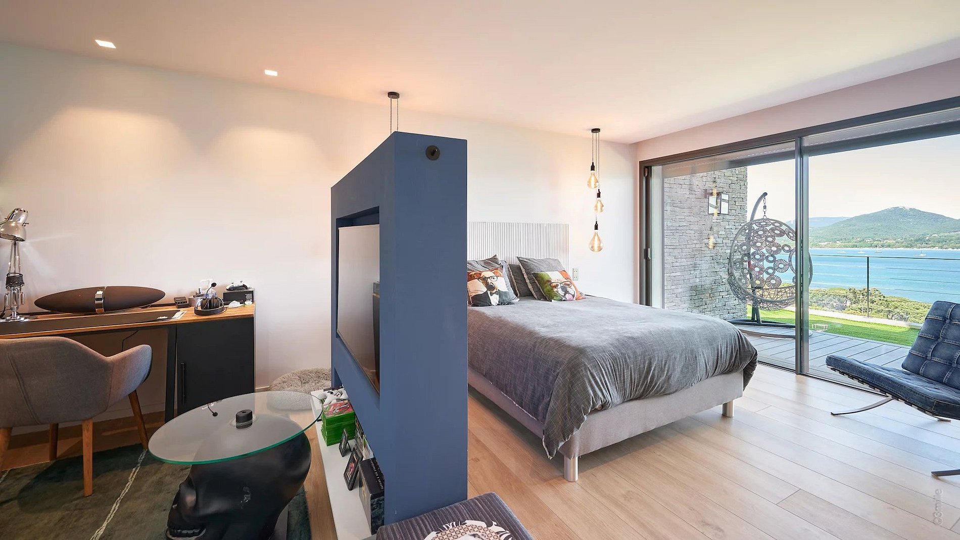 L’espace nuit comprend six chambres, toutes avec vue mer et terrasse privée, dont une somptueuse suite parentale avec dressing et salle de bain complète.