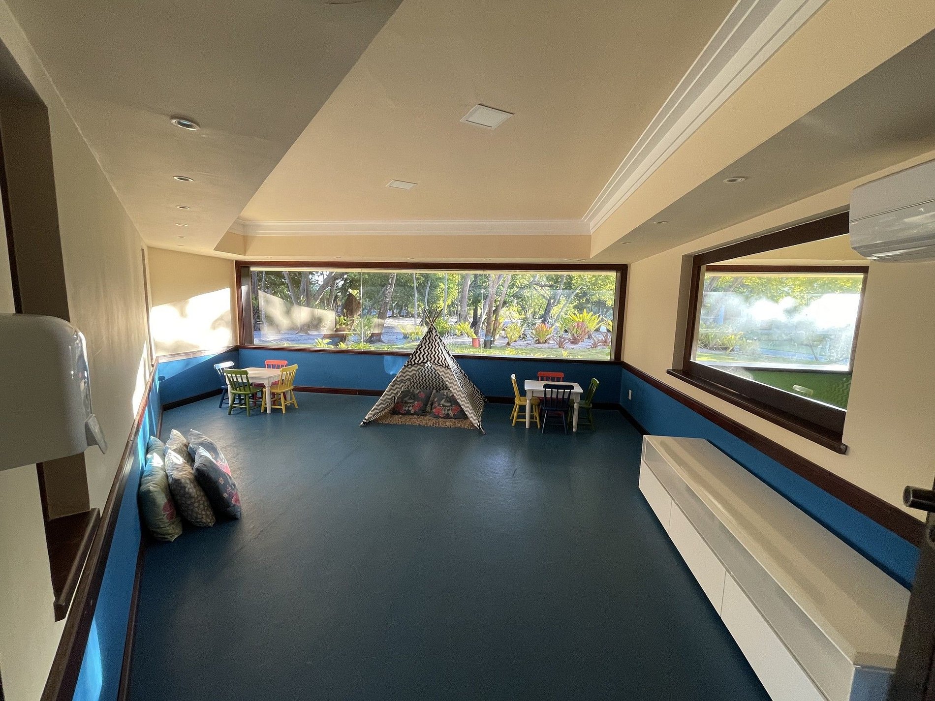 A l’intérieur de la villa se trouve la salle multimédia avec smart TV, canapés et meubles confortables. Son système audio de qualité offre une expérience audiovisuelle incroyable.