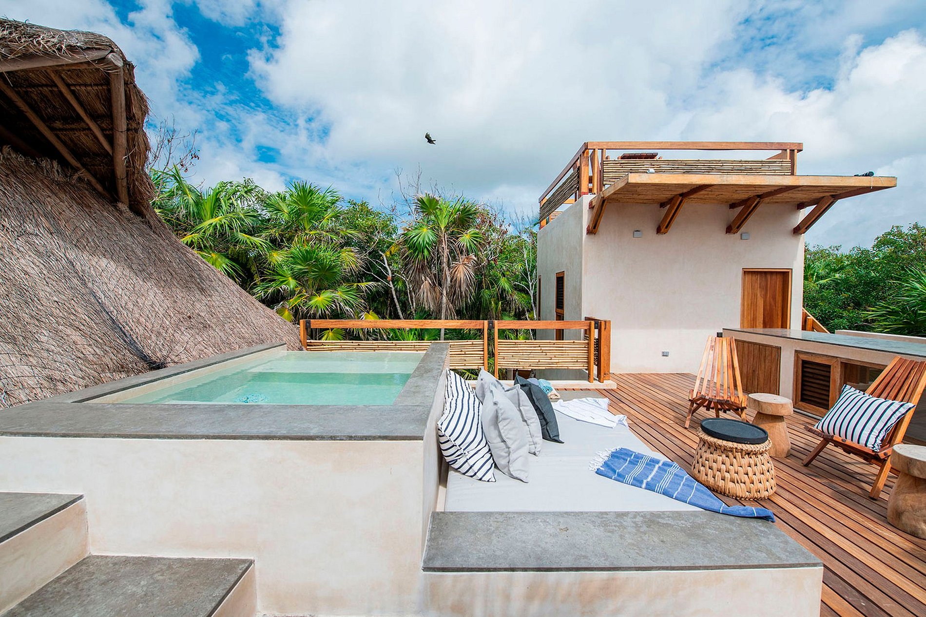 Même avec une piscine qui est pratiquement une œuvre d'art et un bassin profond sur le toit-terrasse, la nature est à l'honneur à la villa. Cette petite propriété éco-consciente se trouve à 3,5 miles dans la réserve de biosphère de Sian Ka'an et est une utopie tropicale.