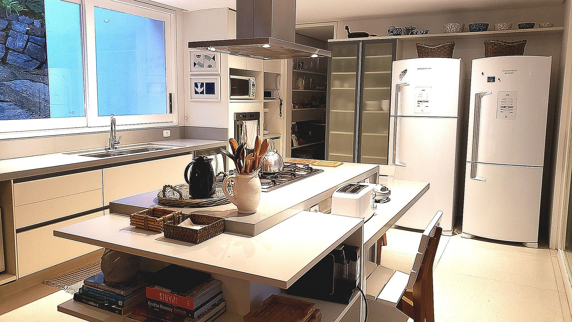 Avec 635 m² de superficie construite sur un terrain de 2 000 m², la maison se compose de cinq chambres, cinq suites et deux salles de bains. Les chambres sont grandes et bien éclairées, avec un mobilier design et une décoration brésilienne mettant en valeur les artistes et artisans locaux. Le séjour ouvert sur la terrasse et la piscine est le lieu idéal pour recevoir amis et famille.