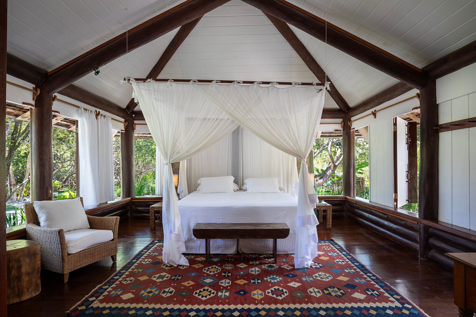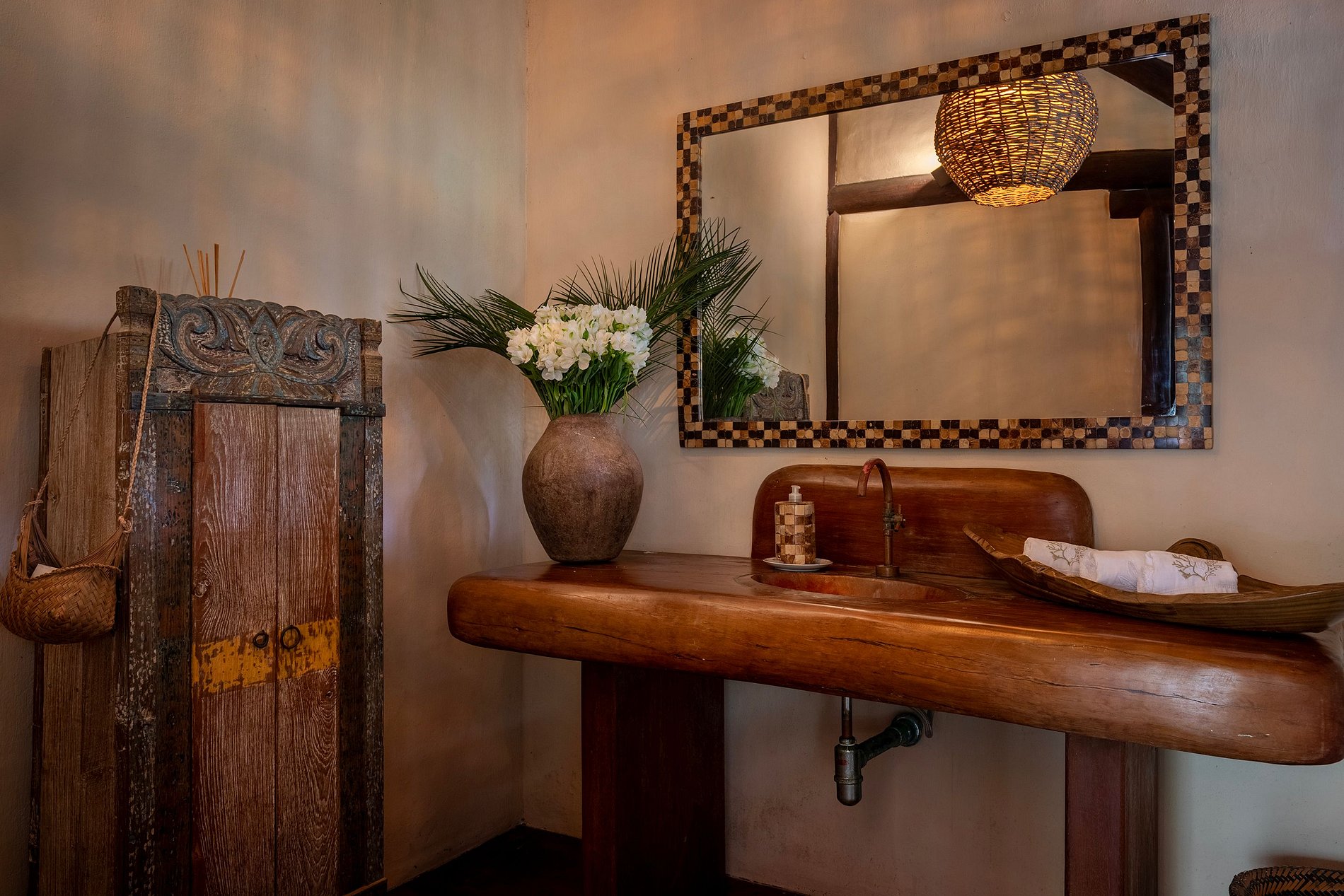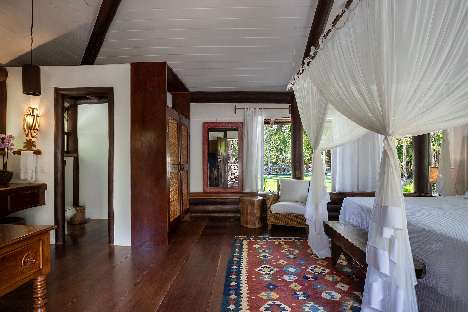 La villa dispose de 06 suites bien réparties entre la maison principale, la maison annexe et les bungalows. Certaines salles de bains suivent l'architecture régionale pour être ouvertes sur le jardin.
