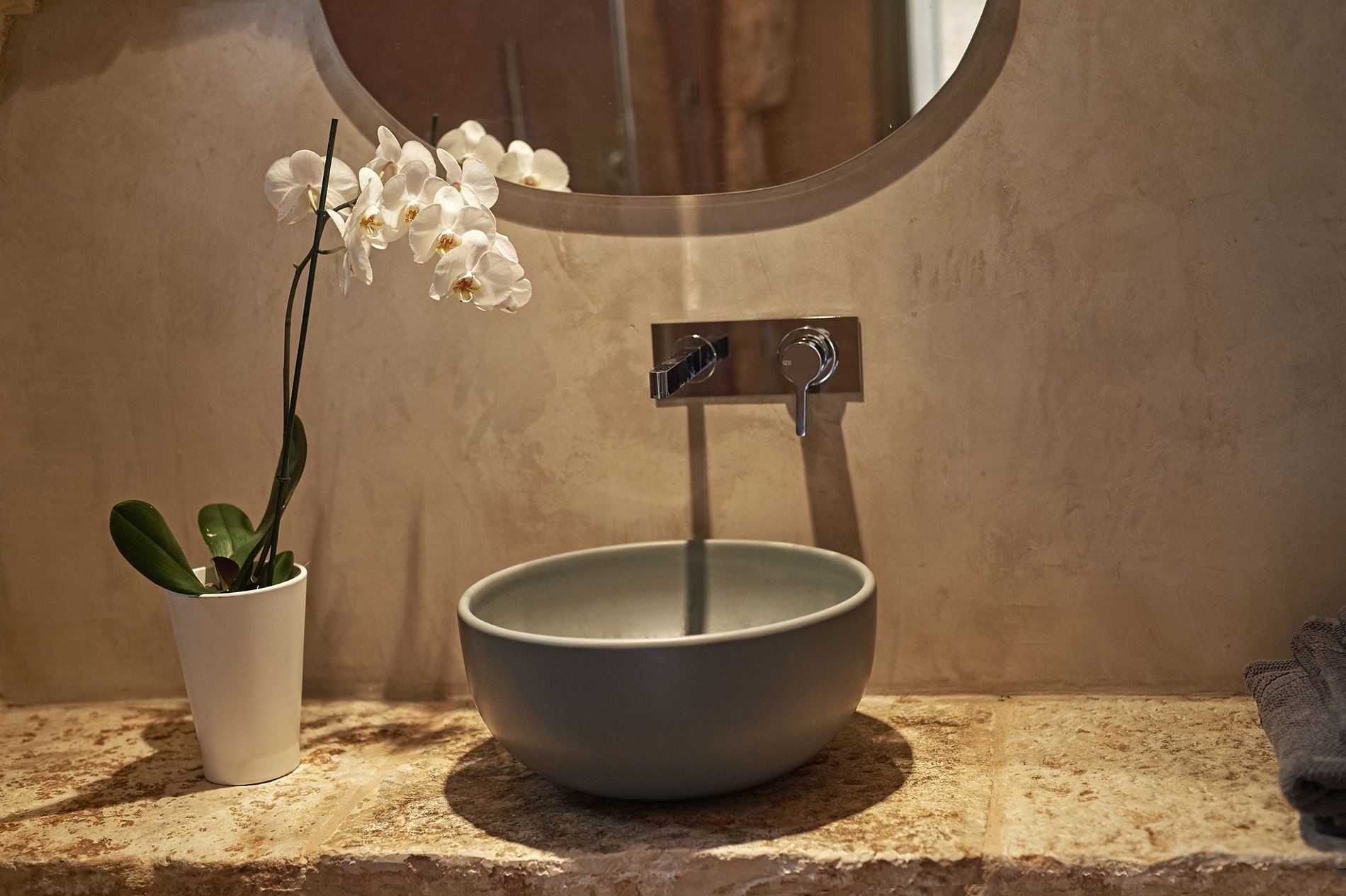 Cette propriété est si intégrée à la nature qu'elle se fond pratiquement dans le paysage fertile qui l'entoure. Les pierres naturelles des allées, des murs d'enceinte et du complexe de bâtiments se mélangent parfaitement aux riches tons verts et terreux du paysage environnant. Les toits d'ardoise blanchis à la chaux des trulli, les cadres vert-bleu des portes et fenêtres, et la piscine éblouissante au cœur de la propriété ajoutent une touche de couleur et de joie.