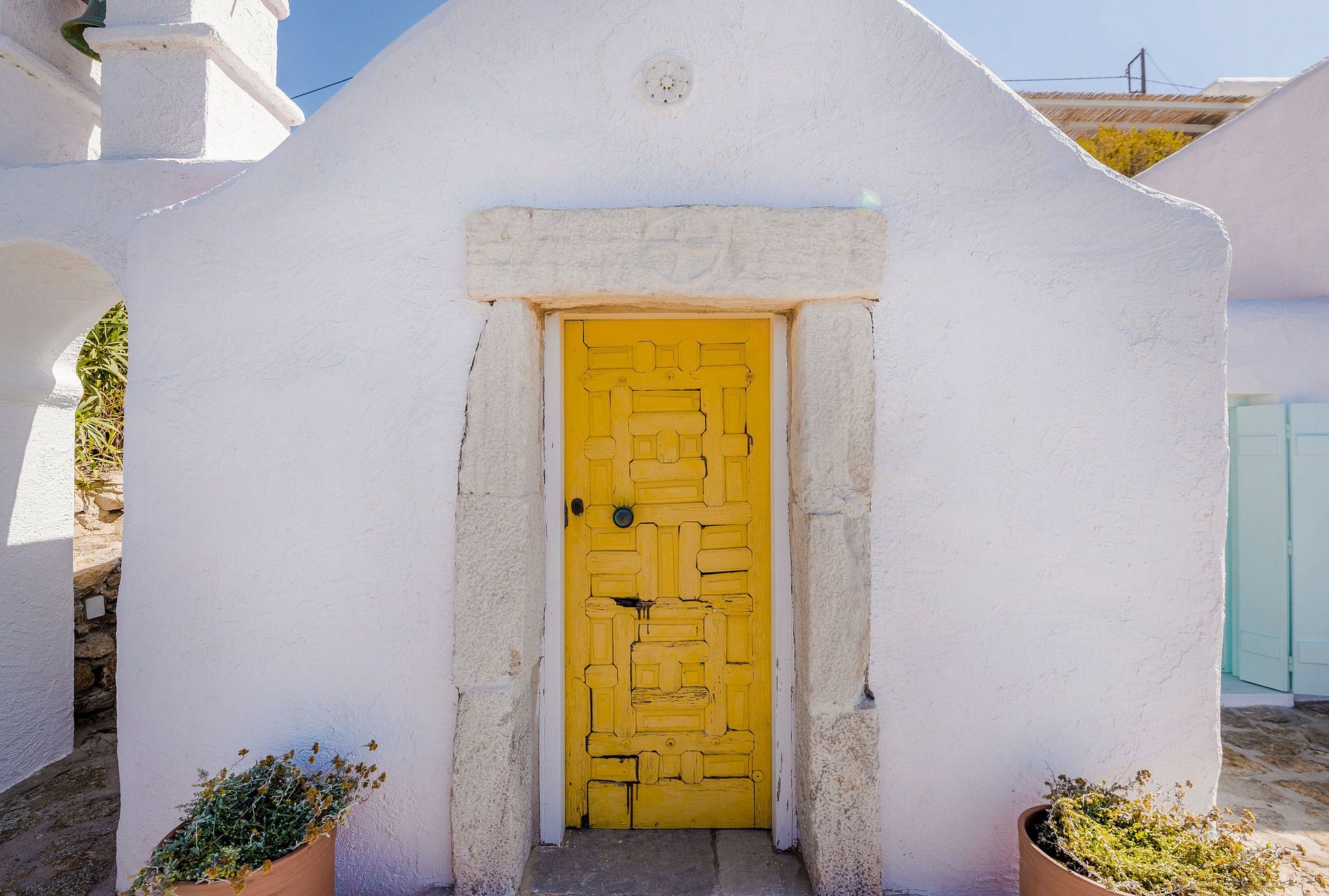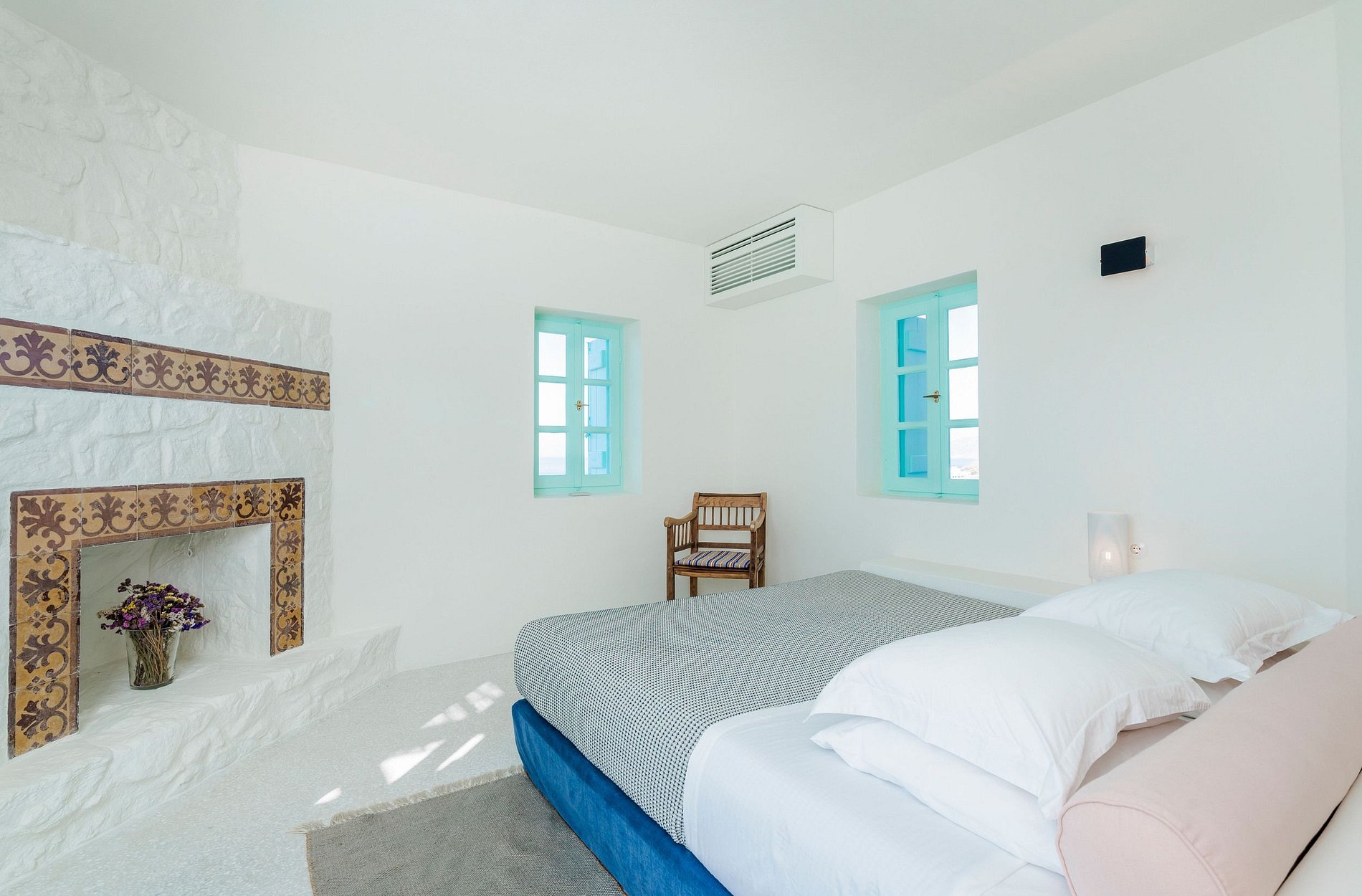La décoration intérieure a été réalisée avec beaucoup de succès dans un style minimaliste percutant avec des touches traditionnels colorés: blanc du sol au plafond, cadres des fenêtres turquoises, œuvres d'art abstraites et cheminées classiques de l'île.