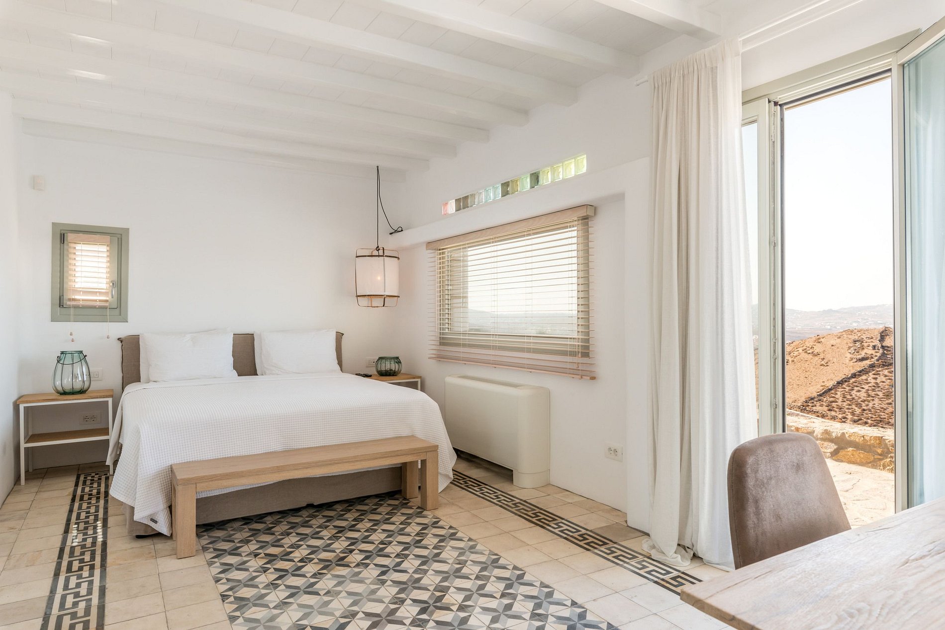 ropriété unique située dans un endroit très privé à Ftelia avec une vue imprenable sur la mer Égée, à 5 km de la ville de Mykonos et à 800 m de la plage de Ftelia. Elle dispose de 7 chambres (6 doubles et 1 simple) et peut accueillir jusqu'à 13 personnes. Les suites disposent d'un mobilier rustique et chic et de grands balcons ou vérandas. L'élégante villa au style contemporain est équipée de la technologie domotique.